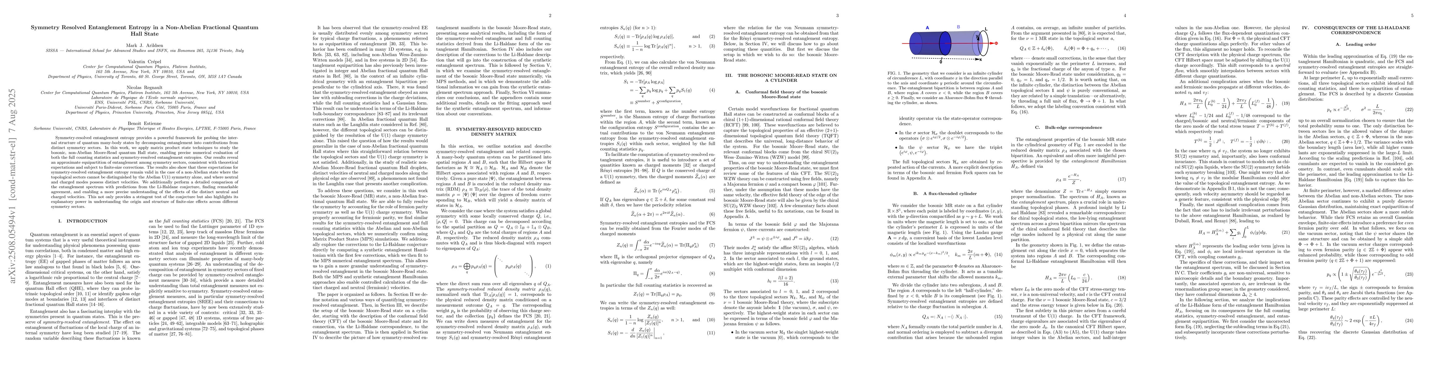 Symmetry-resolved entanglement entropy provides a powerful framework for probing the internal structure of quantum many-body states by decomposing entanglement into contributions from distinct symmetry sectors. In this work, we apply matrix product state techniques to study the bosonic, non-Abelian Moore-Read quantum Hall state, enabling precise numerical evaluation of both the full counting statistics and symmetry-resolved entanglement entropies. Our results reveal an approximate equipartition of entanglement among symmetry sectors, consistent with theoretical expectations and subject to finite-size corrections. The results also show that these expectations for symmetry-resolved entanglement entropy remain valid in the case of a non-Abelian state where the topological sectors cannot be distinguished by the Abelian $\mathrm{U}(1)$ symmetry alone, and where neutral and charged modes possess distinct velocities. We additionally perform a detailed comparison of the entanglement spectrum with predictions from the Li-Haldane conjecture, finding remarkable agreement, and enabling a more precise understanding of the effects of the distinct neutral and charged velocities. This not only provides a stringent test of the conjecture but also highlights its explanatory power in understanding the origin and structure of finite-size effects across different symmetry sectors.