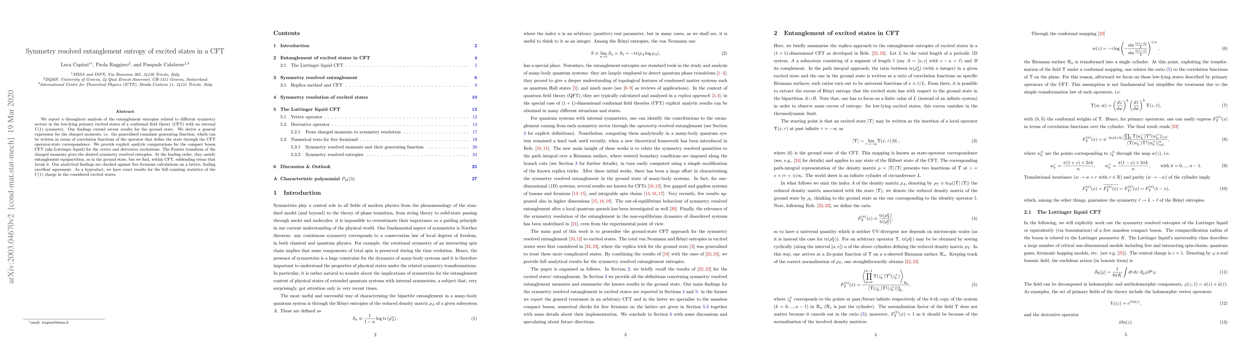 This paper analyzes entanglement entropies in low-lying excited states of a U(1) symmetric CFT, deriving expressions for symmetry-resolved entropies and finding subleading terms that break equipartition. Analytical results for a compact boson CFT are verified against free fermions calculations.