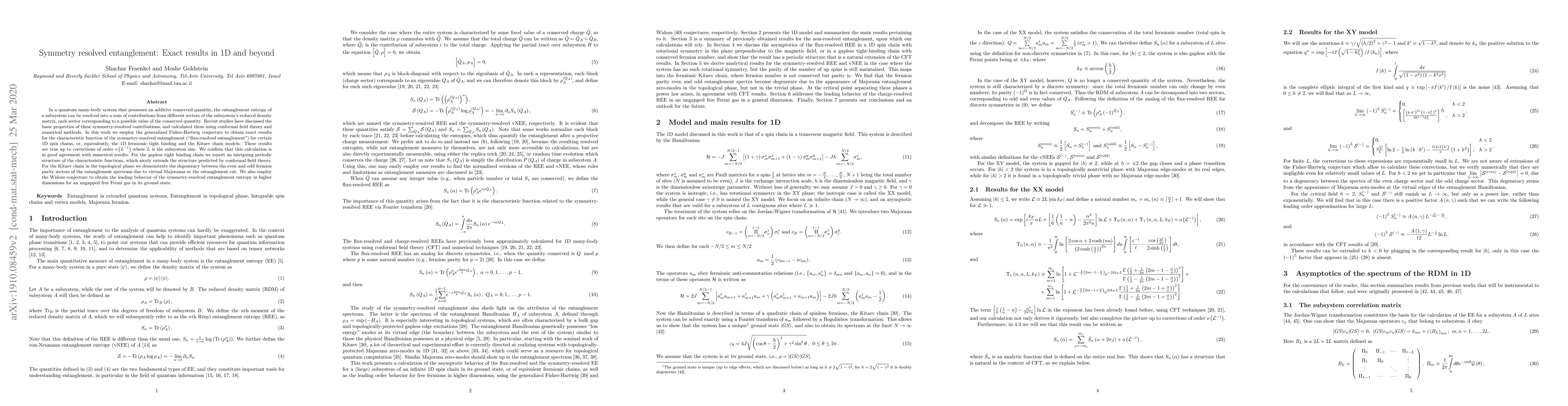 This paper presents exact results for the symmetry-resolved entanglement in 1D spin chains using the generalized Fisher-Hartwig conjecture, revealing periodic structures and parity degeneracies. It also extends these findings to higher dimensions using the Widom conjecture for free Fermi gases.