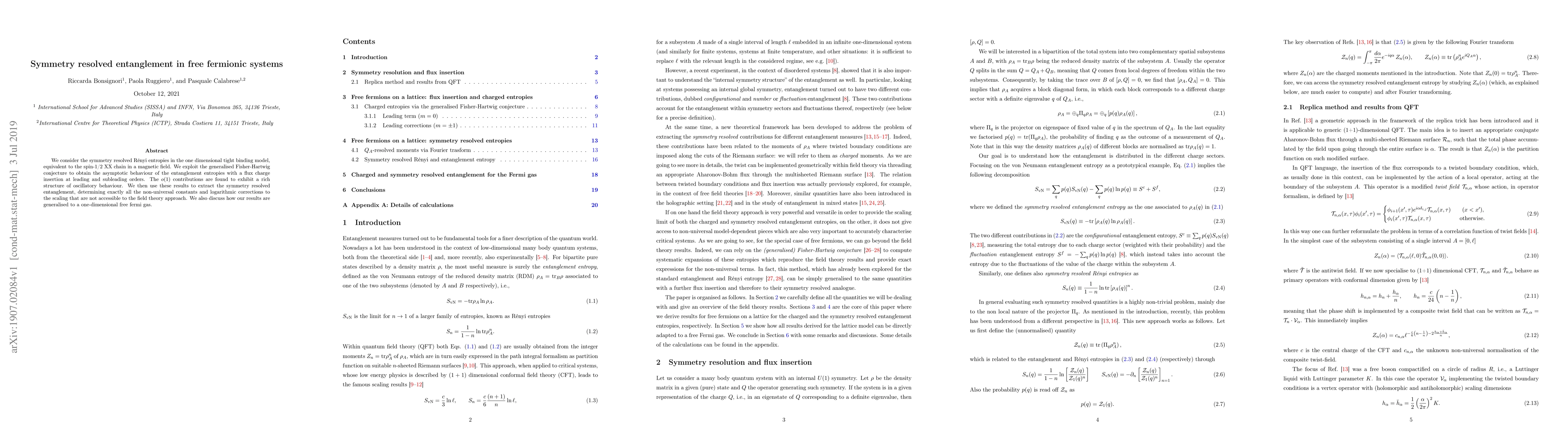 This paper explores symmetry resolved R\'enyi entropies in one-dimensional free fermionic systems, using the generalised Fisher-Hartwig conjecture to determine the asymptotic behavior of entanglement entropies. It reveals rich oscillatory structures in the o(1) contributions and provides exact non-universal constants and logarithmic corrections, extending findings to a one-dimensional free fermi gas.