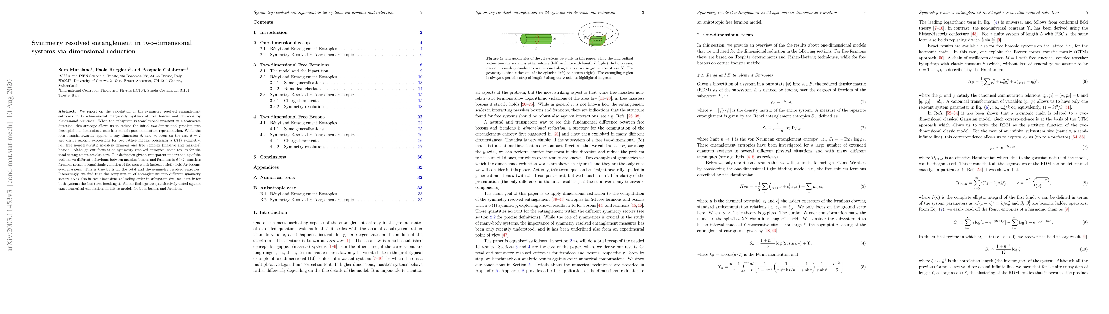This paper calculates symmetry resolved entanglement entropies in two-dimensional systems of free bosons and fermions using dimensional reduction, revealing distinct behaviors between massless bosons and fermions, with logarithmic violations for fermions and area laws for bosons. Numerical tests confirm these findings.