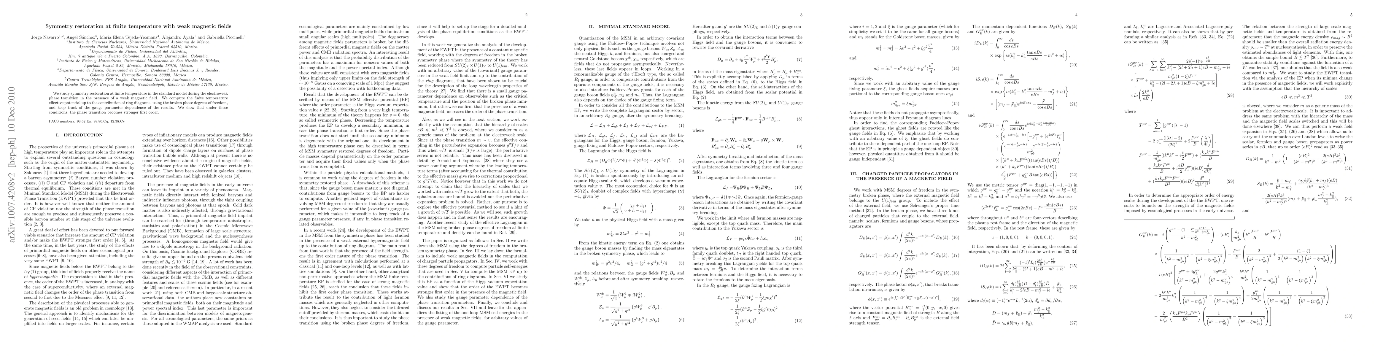 This paper investigates symmetry restoration during the electroweak phase transition in the standard model at finite temperature, considering the influence of weak magnetic fields. The study computes the finite temperature effective potential, revealing that the presence of a weak magnetic field makes the phase transition more pronounced and stronger first order.