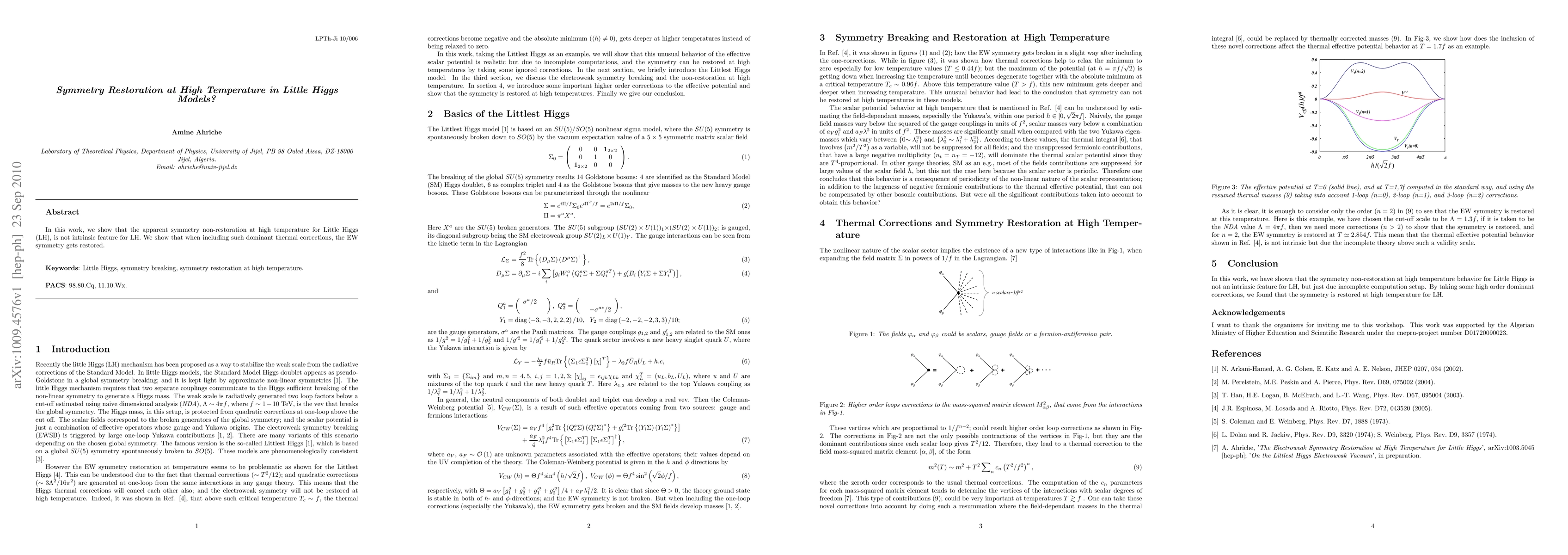 Summary: This study reveals that high-temperature symmetry non-restoration in Little Higgs models is an artifact; with proper thermal corrections, electroweak symmetry is restored at high temperatures.