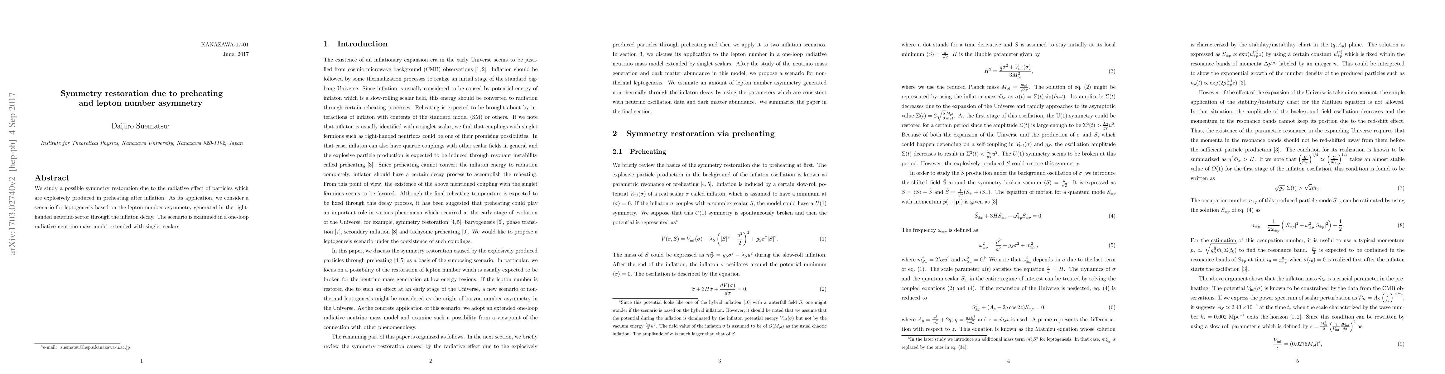 We study a possible symmetry restoration due to the radiative effect of particles which are explosively produced in preheating after inflation. As its application, we consider a scenario for leptogenesis based on the lepton number asymmetry generated in the right-handed neutrino sector through the inflaton decay. The scenario is examined in a one-loop radiative neutrino mass model extended with singlet scalars.