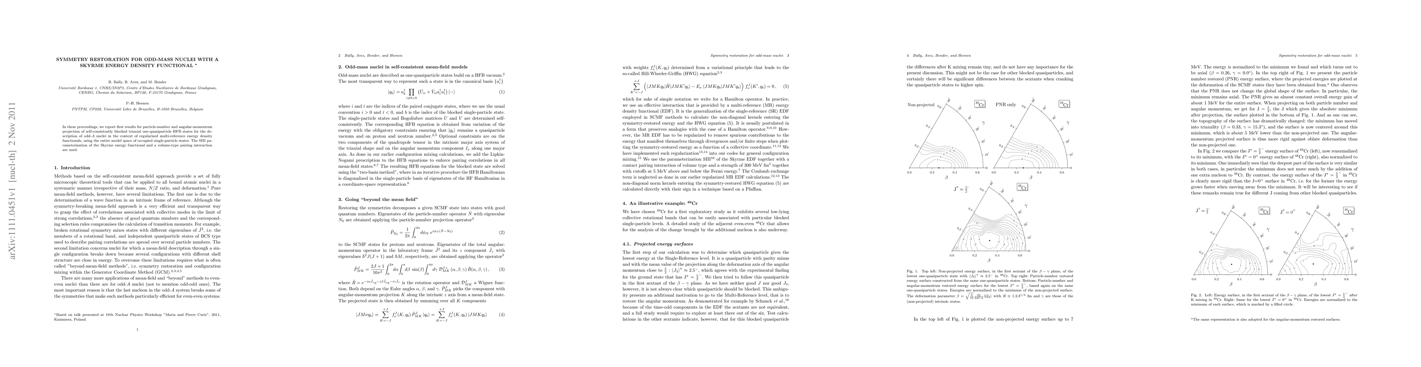 This research explores symmetry restoration in odd-mass nuclei using projected self-consistent triaxial one-quasiparticle HFB states with the SIII Skyrme energy density functional and a volume-type pairing interaction. Initial results demonstrate the effectiveness of this approach in describing odd-A nuclei.