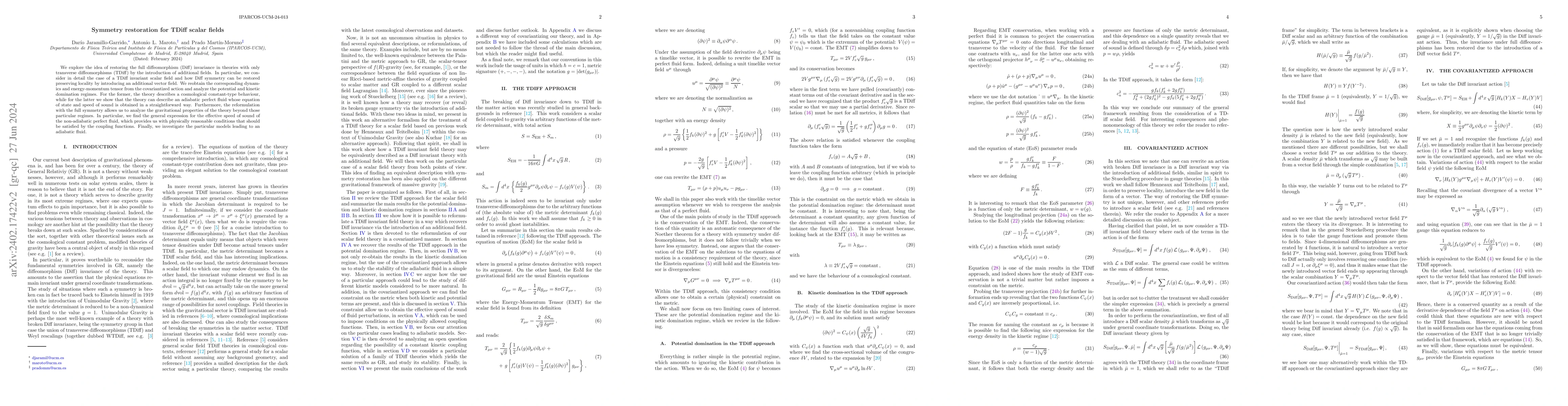 This paper investigates how to restore full diffeomorphism invariance in theories with only transverse diffeomorphisms by introducing additional fields, focusing on scalar fields. It introduces a vector field to restore symmetry, examines dynamics, and analyzes cosmological and fluid behaviors, finding conditions for physically reasonable coupling functions.