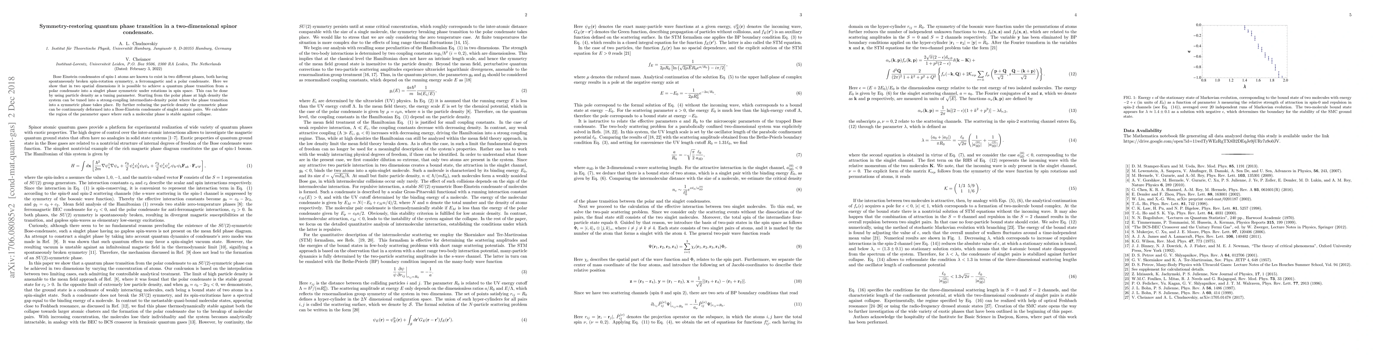 Bose Einstein condensates of spin-1 atoms are known to exist in two different phases, both having spontaneously broken spin-rotation symmetry, a ferromagnetic and a polar condensate. Here we show that in two spatial dimensions it is possible to achieve a quantum phase transition from a polar condensate into a singlet phase symmetric under rotations in spin space. This can be done by using particle density as a tuning parameter. Starting from the polar phase at high density the system can be tuned into a strong-coupling intermediate-density point where the phase transition into a symmetric phase takes place. By further reducing the particle density the symmetric phase can be continuously deformed into a Bose-Einstein condensate of singlet atomic pairs. We calculate the region of the parameter space where such a molecular phase is stable against collapse.