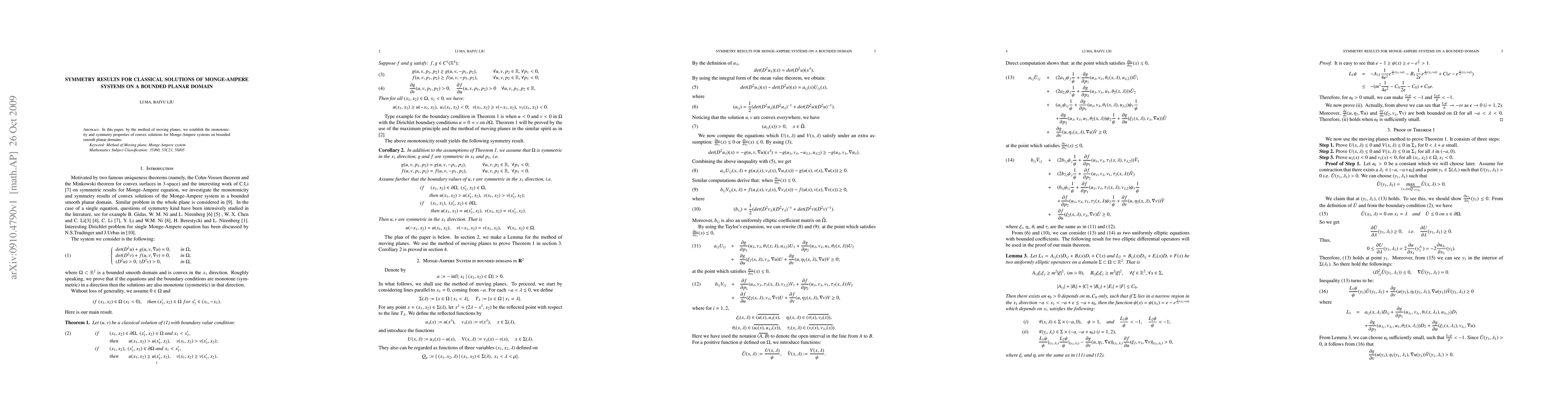 In this paper, by the method of moving planes, we establish the monotonicity and symmetry properties of convex solutions for Monge-Ampere systems on bounded smooth planar domains.