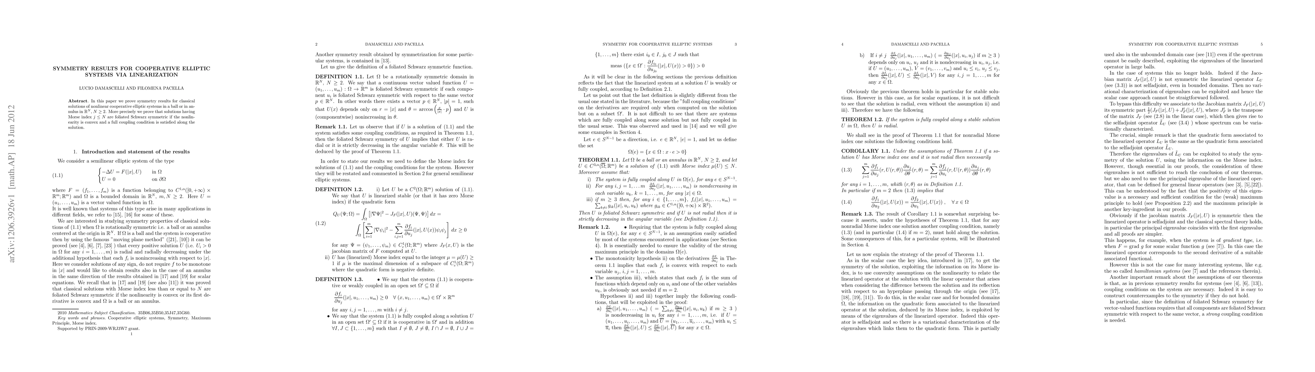This paper proves symmetry results for classical solutions of nonlinear cooperative elliptic systems, showing that solutions with Morse index $j \leq N$ are foliated Schwarz symmetric when the nonlinearity is convex and a full coupling condition is met. The analysis focuses on solutions in balls or annuli in $\mathbb{R}^N$, $N \geq 2$.