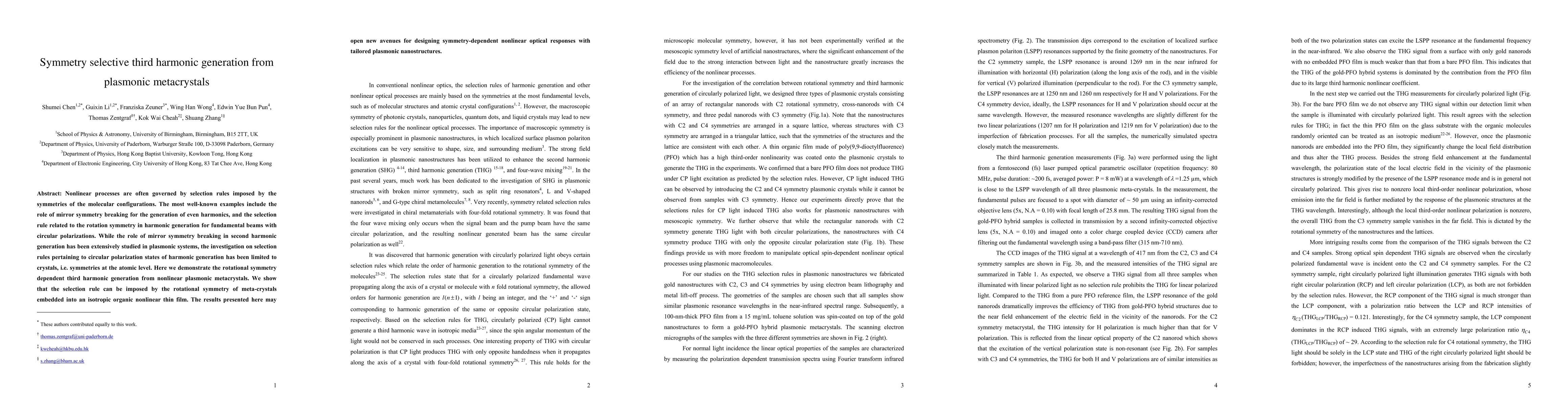 This paper demonstrates third harmonic generation in plasmonic metacrystals that selectively follows rotational symmetry selection rules. It shows that metacrystals embedded in an isotropic organic film can enforce these rules, potentially enabling the design of tailored nonlinear optical responses.