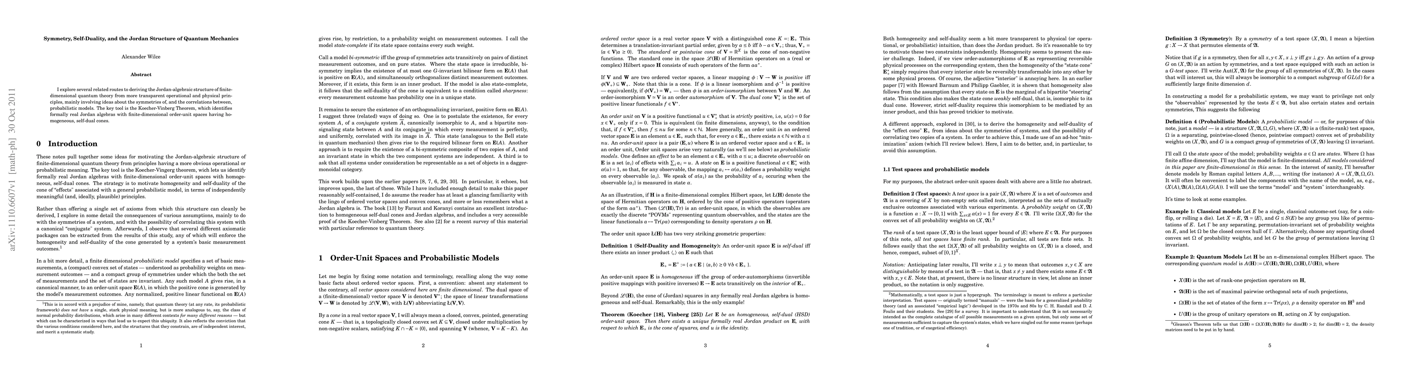 I explore several related routes to deriving the Jordan-algebraic structure of finite-dimensional quantum theory from more transparent operational or physical principles, mainly involving ideas about the symmetries of, and the correlations between, probabilistic models. The key tool is the Koecher-Vinberg Theorem, which identifies formally real Jordan algebras with finite-dimensional order-unit spaces having homogeneous, self-dual cones.