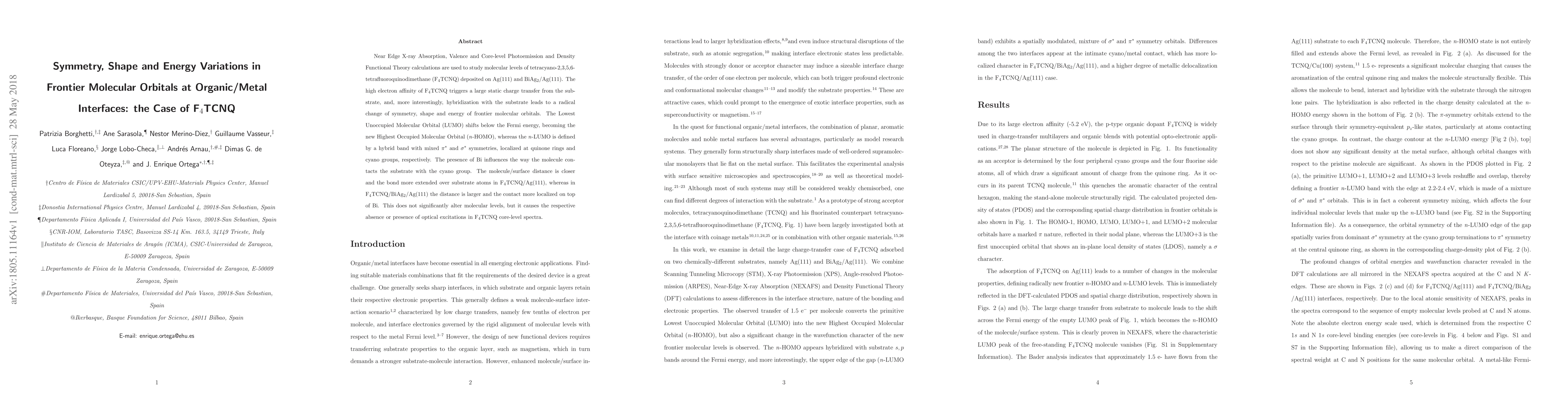 Near Edge X-ray Absorption, Valence and Core-level Photoemission and Density Functional Theory calculations are used to study molecular levels of tetracyano-2,3,5,6-tetrafluoroquinodimethane (F$_4$TCNQ) deposited on Ag(111) and BiAg$_2$/Ag(111). The high electron affinity of F$_4$TCNQ triggers a large static charge transfer from the substrate, and, more interestingly, hybridization with the substrate leads to a radical change of symmetry, shape and energy of frontier molecular orbitals. The Lowest Unoccupied Molecular Orbital (LUMO) shifts below the Fermi energy, becoming the new Highest Occupied Molecular Orbital ($n$-HOMO), whereas the $n$-LUMO is defined by a hybrid band with mixed $\pi^*$ and $\sigma^*$ symmetries, localized at quinone rings and cyano groups, respectively. The presence of Bi influences the way the molecule contacts the substrate with the cyano group. The molecule/surface distance is closer and the bond more extended over substrate atoms in F$_4$TCNQ/Ag(111), whereas in F$_4$TCNQ/BiAg$_2$/Ag(111) the distance is larger and the contact more localized on top of Bi. This does not significantly alter molecular levels, but it causes the respective absence or presence of optical excitations in F$_4$TCNQ core-level spectra.