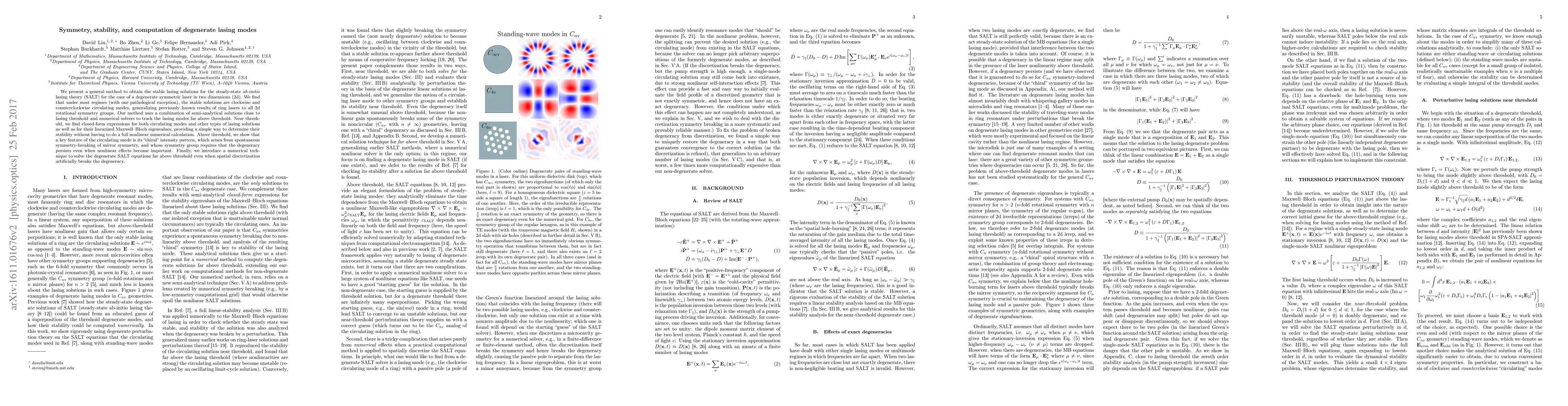 We present a general method to obtain the stable lasing solutions for the steady-state ab-initio lasing theory (SALT) for the case of a degenerate symmetric laser in two dimensions (2d). We find that under most regimes (with one pathological exception), the stable solutions are clockwise and counterclockwise circulating modes, generalizing previously known results of ring lasers to all 2d rotational symmetry groups. Our method uses a combination of semi-analytical solutions close to lasing threshold and numerical solvers to track the lasing modes far above threshold. Near threshold, we find closed-form expressions for both circulating modes and other types of lasing solutions as well as for their linearized Maxwell--Bloch eigenvalues, providing a simple way to determine their stability without having to do a full nonlinear numerical calculation. Above threshold, we show that a key feature of the circulating mode is its "chiral" intensity pattern, which arises from spontaneous symmetry-breaking of mirror symmetry, and whose symmetry group requires that the degeneracy persists even when nonlinear effects become important. Finally, we introduce a numerical technique to solve the degenerate SALT equations far above threshold even when spatial discretization artificially breaks the degeneracy.