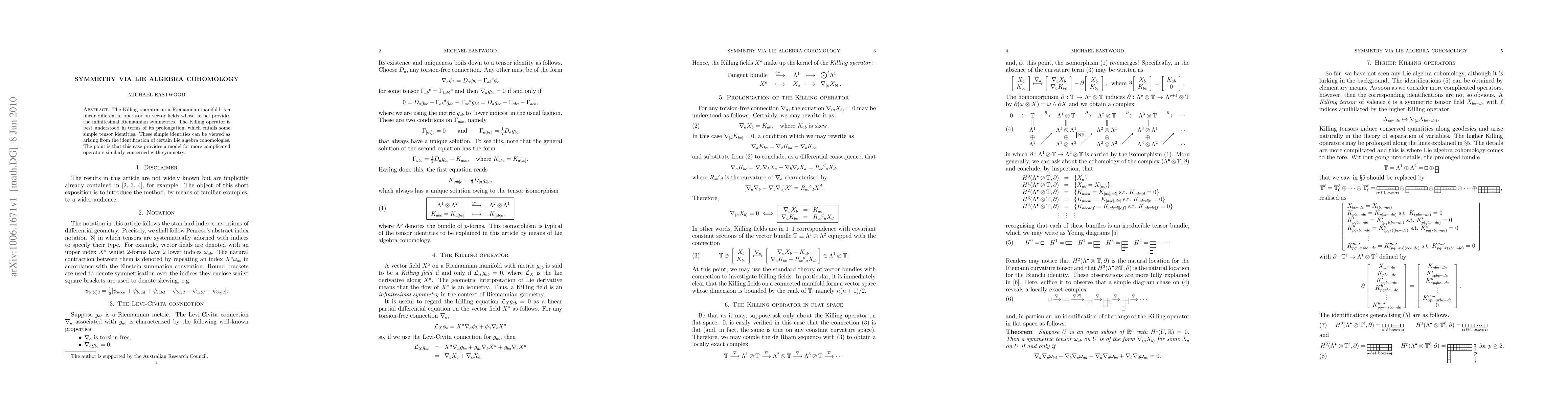 The Killing operator on a Riemannian manifold is a linear differential operator on vector fields whose kernel provides the infinitesimal Riemannian symmetries. The Killing operator is best understood in terms of its prolongation, which entails some simple tensor identities. These simple identities can be viewed as arising from the identification of certain Lie algebra cohomologies. The point is that this case provides a model for more complicated operators similarly concerned with symmetry.