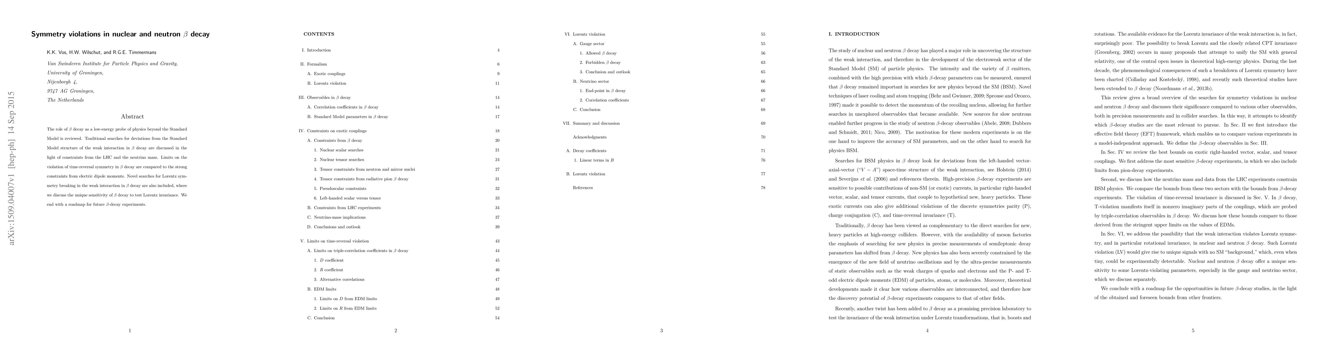 This paper reviews $\beta$ decay's role in probing physics beyond the Standard Model, discussing symmetry violations and novel searches for Lorentz symmetry breaking, and concludes with a roadmap for future $\beta$-decay experiments. It compares limits on time-reversal symmetry violations to electric dipole moments and highlights $\beta$ decay's unique sensitivity to test Lorentz invariance.