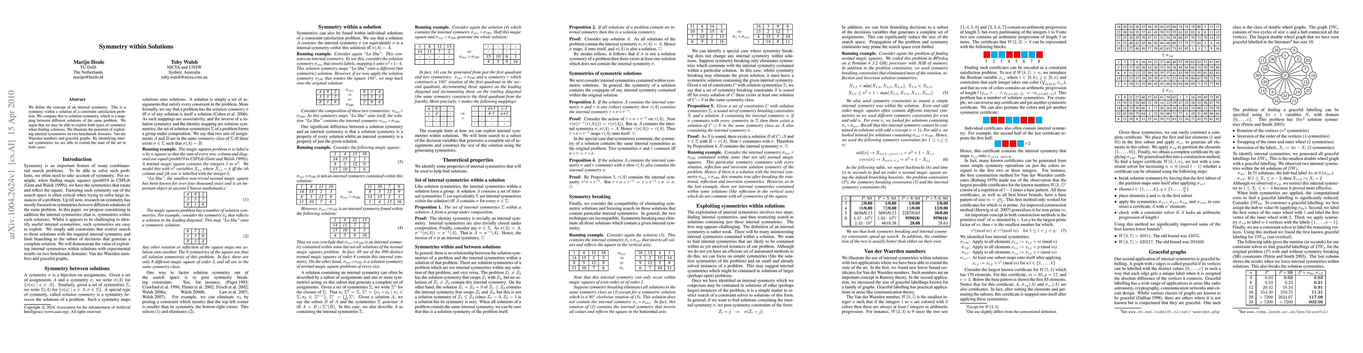 We define the concept of an internal symmetry. This is a symmety within a solution of a constraint satisfaction problem. We compare this to solution symmetry, which is a mapping between different solutions of the same problem. We argue that we may be able to exploit both types of symmetry when finding solutions. We illustrate the potential of exploiting internal symmetries on two benchmark domains: Van der Waerden numbers and graceful graphs. By identifying internal symmetries we are able to extend the state of the art in both cases.
