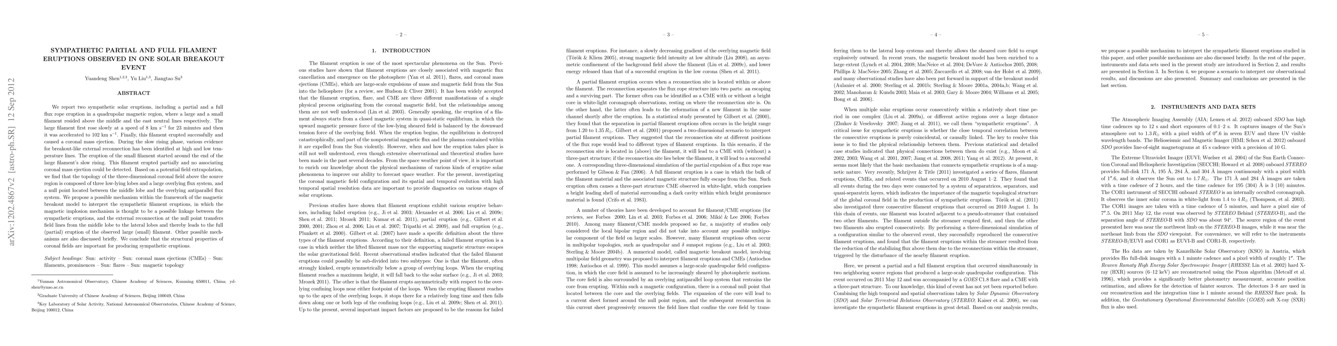 This paper reports two sympathetic solar eruptions in a quadrupolar magnetic region, where a large filament erupted fully and a small filament erupted partially. The study proposes a magnetic breakout model to explain the sympathetic eruptions, suggesting that external reconnection at a null point drives the magnetic implosion and influences the eruption dynamics.