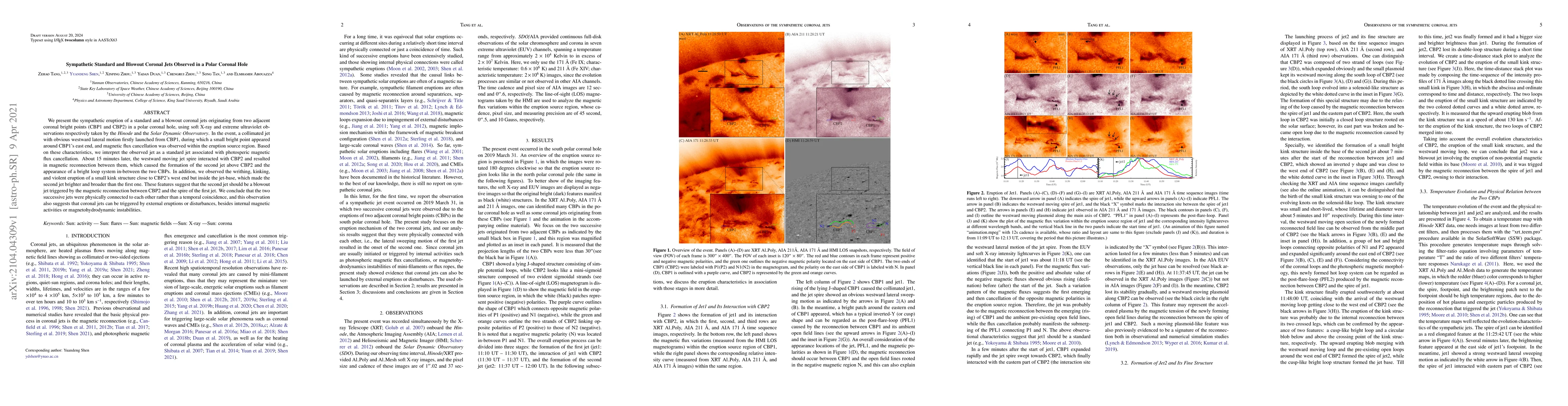 This study observes a sympathetic eruption of two coronal jets from adjacent bright points in a polar coronal hole, identifying a standard jet from CBP1 linked to magnetic flux cancellation, followed by a blowout jet from CBP2 triggered by interaction with the first jet's spire, suggesting external disturbances can initiate coronal jets.