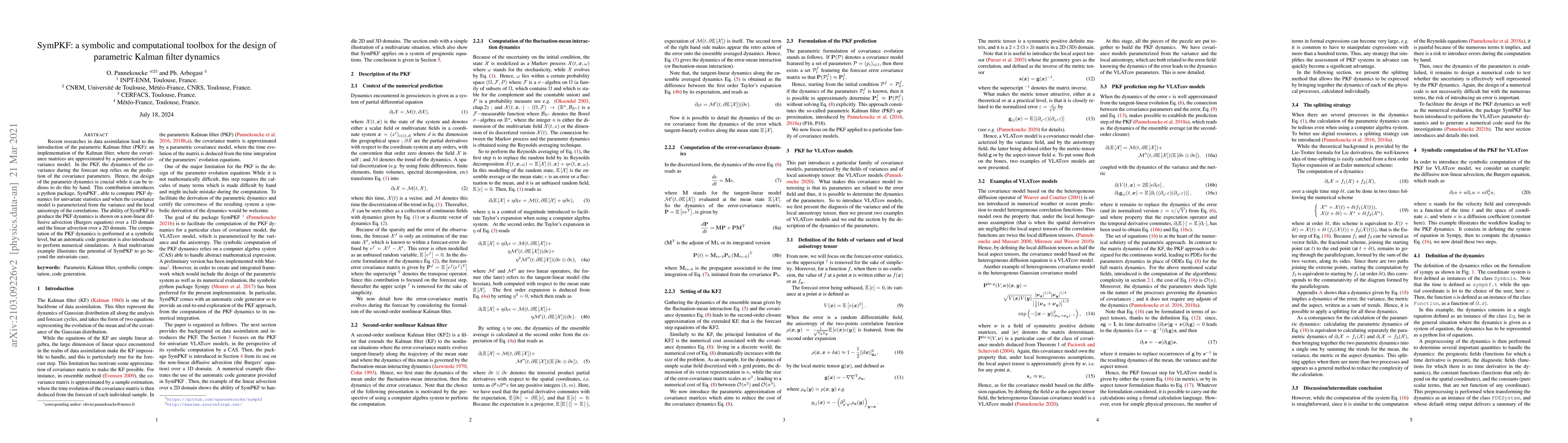 The research introduces SymPKF, a Python toolbox that simplifies the design of parametric Kalman filter (PKF) dynamics. SymPKF computes PKF dynamics for univariate statistics using a parameterized covariance model, and it also includes a code generator for numerical simulations. The toolbox's effectiveness is demonstrated through examples of non-linear and linear advection equations, with potential for multivariate applications.