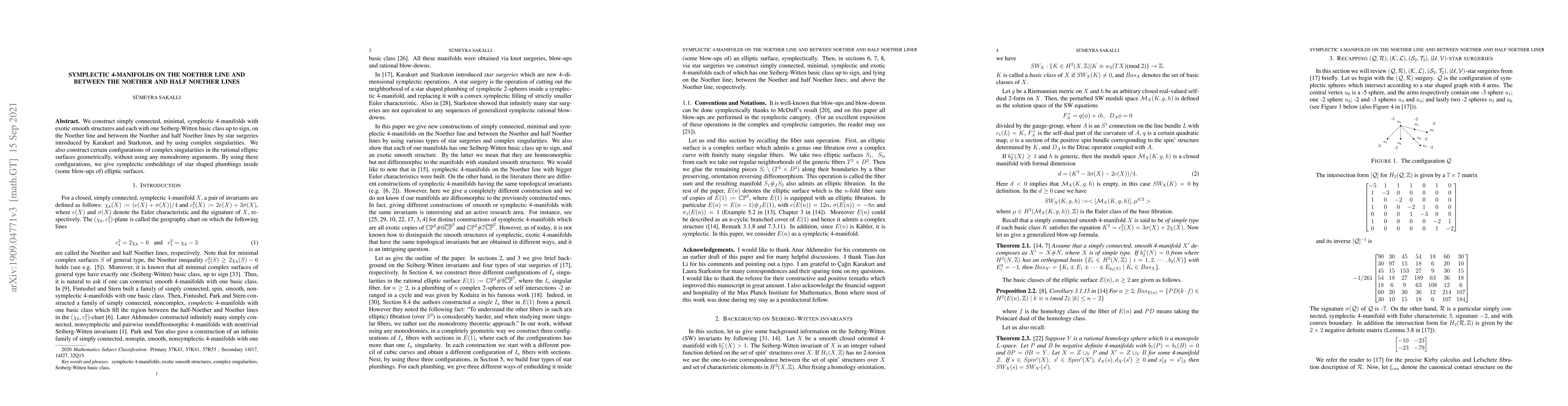 We construct simply connected, minimal, symplectic 4-manifolds with exotic smooth structures and each with one Seiberg-Witten basic class up to sign, on the Noether line and between the Noether and half Noether lines by star surgeries introduced by Karakurt and Starkston, and by using complex singularities. We also construct certain configurations of complex singularities in the rational elliptic surfaces geometrically, without using any monodromy arguments. By using these configurations, we give symplectic embeddings of star shaped plumbings inside (some blow-ups of) elliptic surfaces.