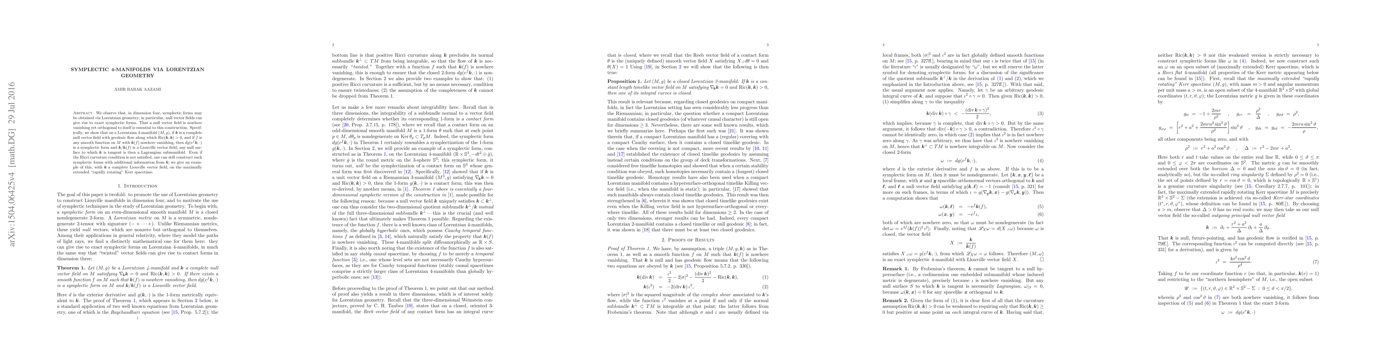 We observe that, in dimension four, symplectic forms may be obtained via Lorentzian geometry; in particular, null vector fields can give rise to exact symplectic forms. That a null vector field is nowhere vanishing yet orthogonal to itself is essential to this construction. Specifically, we show that on a Lorentzian 4-manifold $(M,g)$, if ${\boldsymbol k}$ is a complete null vector field with geodesic flow along which $\text{Ric}({\boldsymbol k},{\boldsymbol k}) > 0$, and if $f$ is any smooth function on $M$ with ${\boldsymbol k}(f)$ nowhere vanishing, then $dg(e^f{\boldsymbol k},\cdot)$ is a symplectic form and ${\boldsymbol k}/{\boldsymbol k}(f)$ is a Liouville vector field; any null surface to which ${\boldsymbol k}$ is tangent is then a Lagrangian submanifold. Even if the Ricci curvature condition is not satisfied, one can still construct such symplectic forms with additional information from ${\boldsymbol k}$; we give an example of this, with ${\boldsymbol k}$ a complete Liouville vector field, on the maximally extended "rapidly rotating" Kerr spacetime.