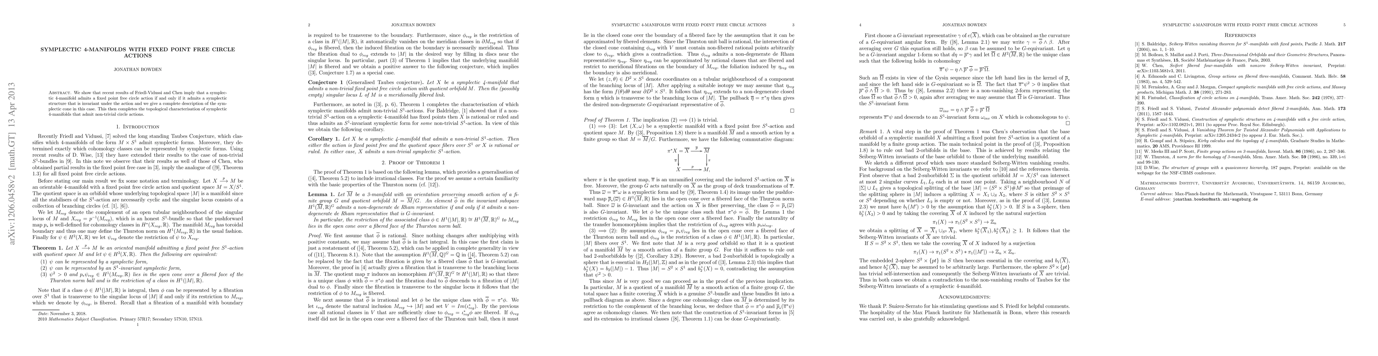 The paper proves that symplectic 4-manifolds allow fixed point free circle actions if and only if they admit symplectic circle actions, providing a full description of the symplectic cone in such cases. This completes the classification of symplectic 4-manifolds with non-trivial circle actions.
