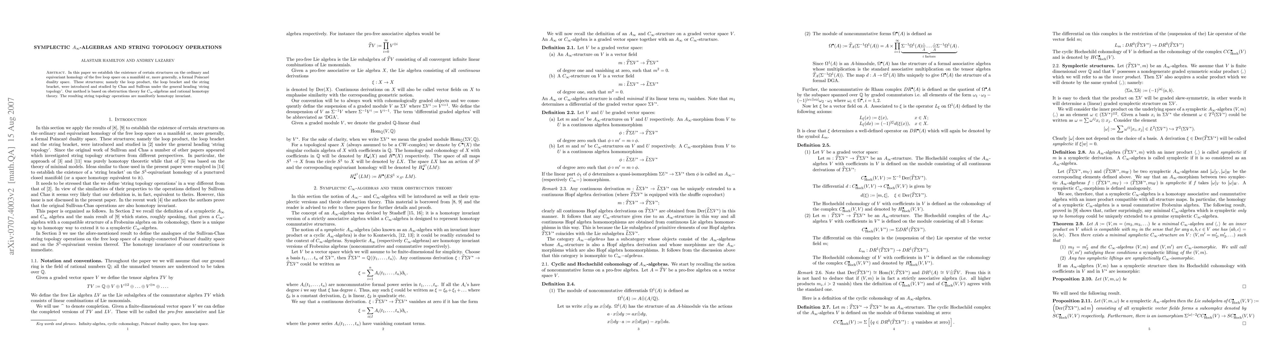 This paper introduces and establishes the existence of string topology operations, including the loop product, loop bracket, and string bracket, on the homology of free loop spaces using $A_\infty$-algebras and rational homotopy theory, ensuring their homotopy invariance.