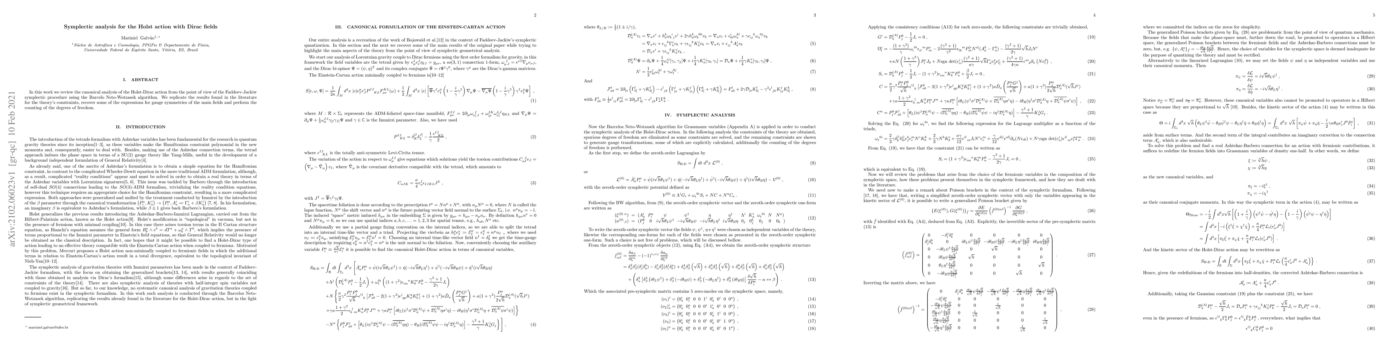 This paper reviews the canonical analysis of the Holst-Dirac action through the Faddeev-Jackiw symplectic method, utilizing the Barcelo Neto-Wotzasek algorithm to replicate known constraints, gauge symmetries, and degrees of freedom.