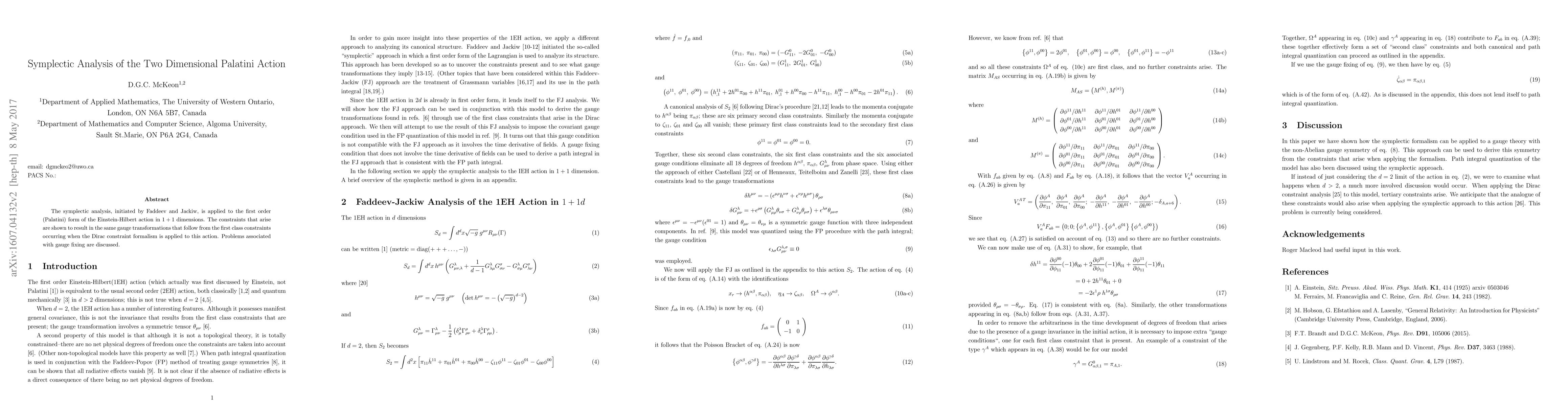 This paper applies symplectic analysis to the two-dimensional Palatini form of the Einstein-Hilbert action, demonstrating that the constraints yield the same gauge transformations as those from the Dirac constraint formalism. It also discusses challenges related to gauge fixing.