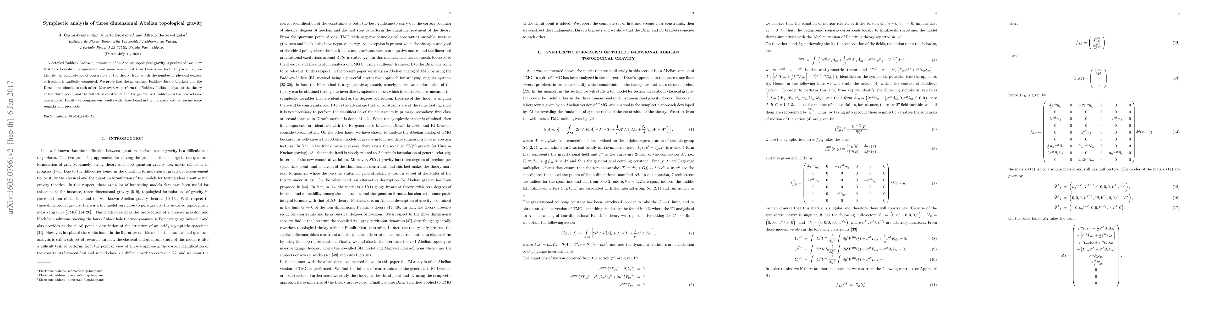 A detailed Faddeev-Jackiw quantization of an Abelian topological gravity is performed; we show that this formalism is equivalent and more economical than Dirac's method. In particular, we identify the complete set of constraints of the theory, from which the number of physical degrees of freedom is explicitly computed. We prove that the generalized Faddeev-Jackiw brackets and the Dirac ones coincide to each other. Moreover, we perform the Faddeev-Jackiw analysis of the theory at the chiral point, and the full set of constraints and the generalized Faddeev-Jackiw brackets are constructed. Finally we compare our results with those found in the literature and we discuss some remarks and prospects.