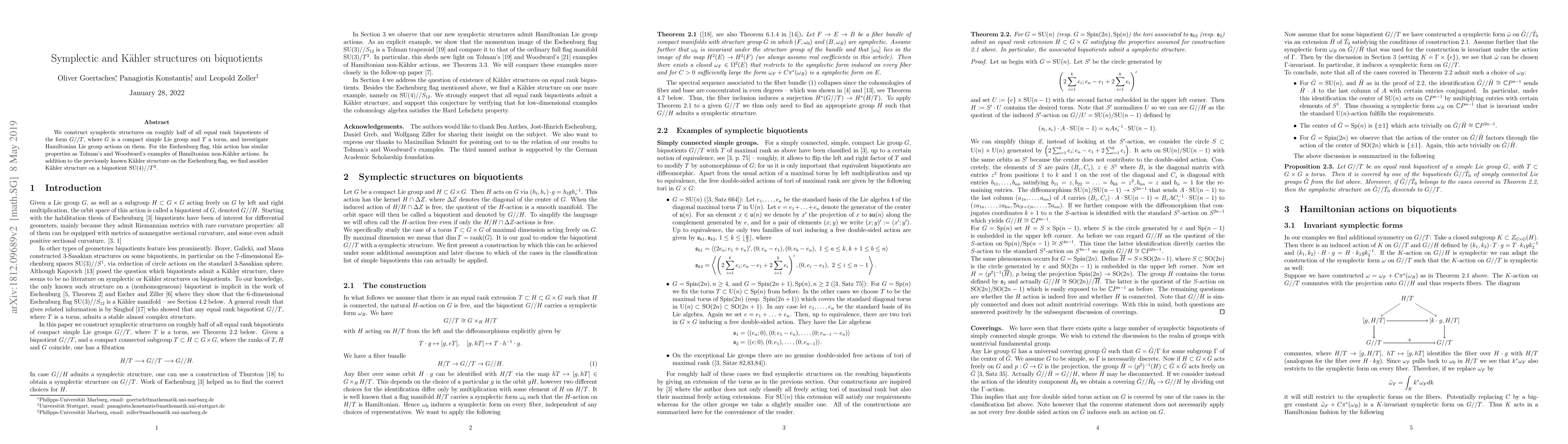 We construct symplectic structures on roughly half of all equal rank biquotients of the form $G//T$, where $G$ is a compact simple Lie group and $T$ a torus, and investigate Hamiltonian Lie group actions on them. For the Eschenburg flag, this action has similar properties as Tolman's and Woodward's examples of Hamiltonian non-K\"ahler actions. In addition to the previously known K\"ahler structure on the Eschenburg flag, we find another K\"ahler structure on a biquotient $\mathrm{SU}(4)//T^3$.