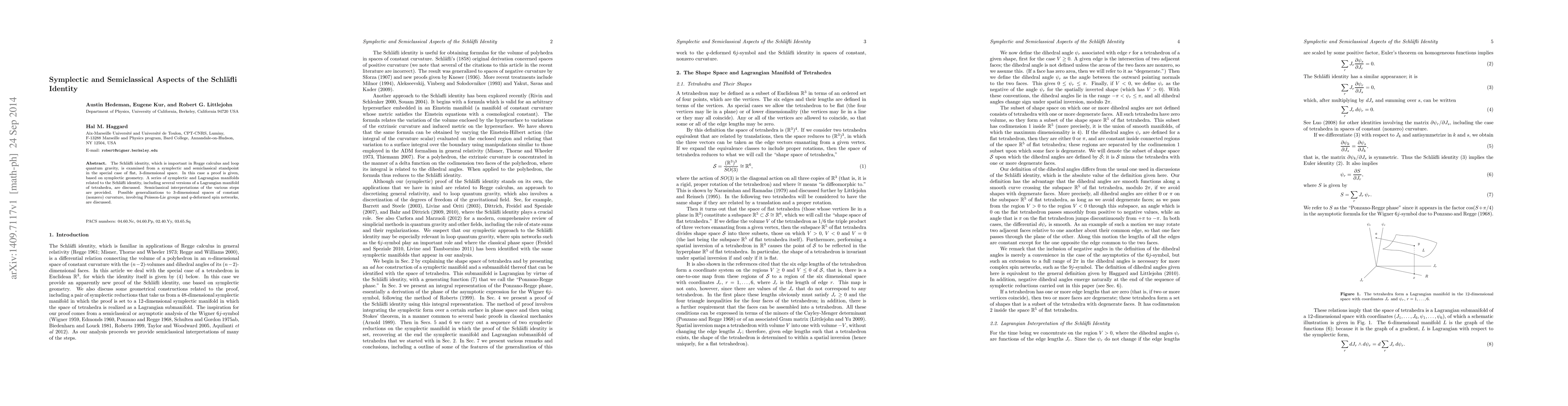 The Schl\"afli identity is proven in flat 3-dimensional space using symplectic geometry, while its semiclassical interpretations are explored. The study also discusses possible extensions to curved spaces using Poisson-Lie groups and q-deformed spin networks.