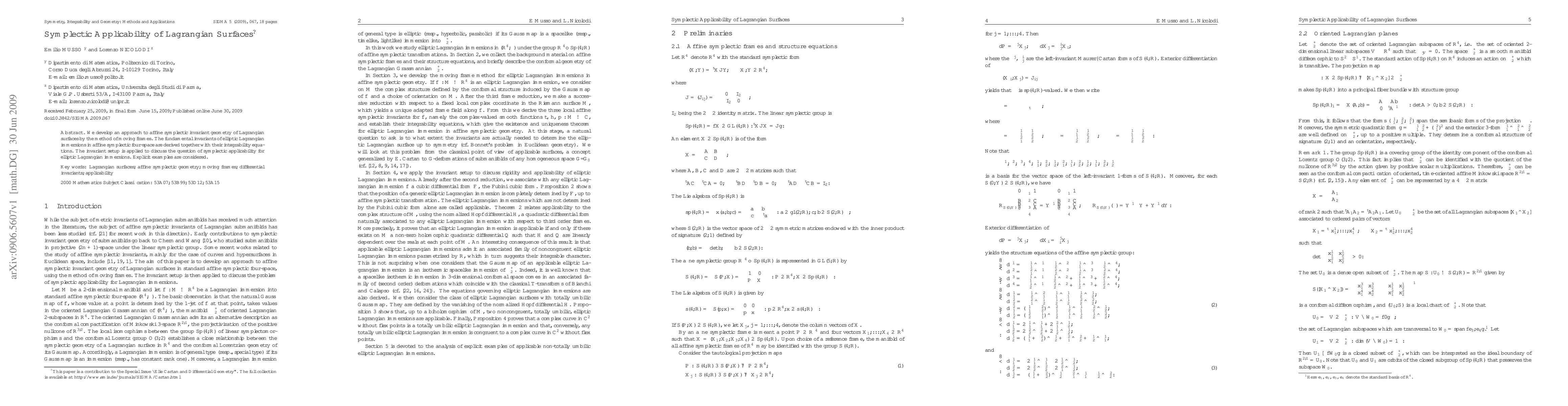 We develop an approach to affine symplectic invariant geometry of Lagrangian surfaces by the method of moving frames. The fundamental invariants of elliptic Lagrangian immersions in affine symplectic four-space are derived together with their integrability equations. The invariant setup is applied to discuss the question of symplectic applicability for elliptic Lagrangian immersions. Explicit examples are considered.
