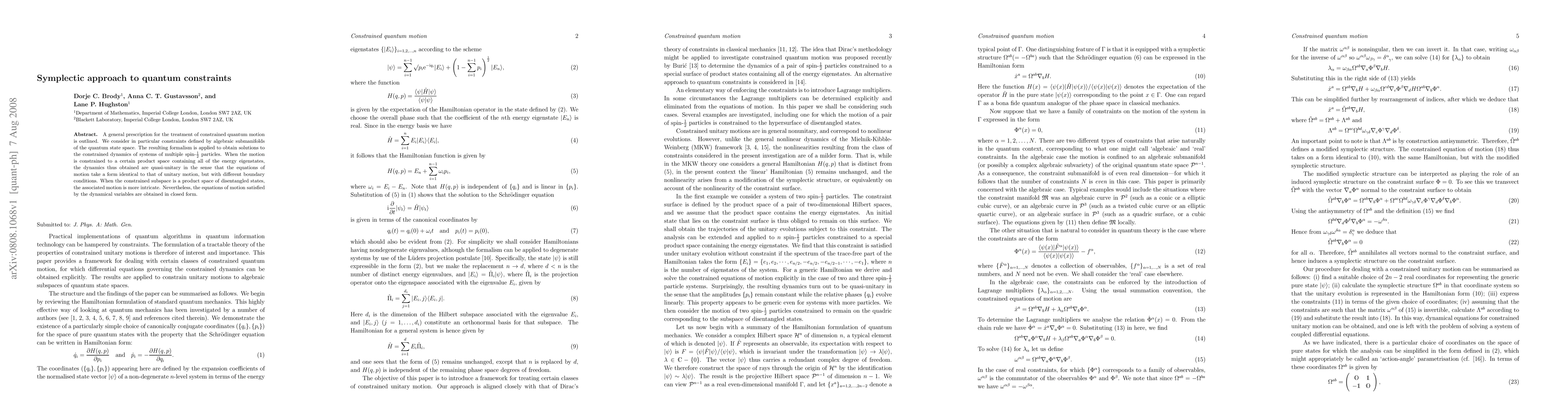 A general prescription for the treatment of constrained quantum motion is outlined. We consider in particular constraints defined by algebraic submanifolds of the quantum state space. The resulting formalism is applied to obtain solutions to the constrained dynamics of systems of multiple spin-1/2 particles. When the motion is constrained to a certain product space containing all of the energy eigenstates, the dynamics thus obtained are quasi-unitary in the sense that the equations of motion take a form identical to that of unitary motion, but with different boundary conditions. When the constrained subspace is a product space of disentangled states, the associated motion is more intricate. Nevertheless, the equations of motion satisfied by the dynamical variables are obtained in closed form.