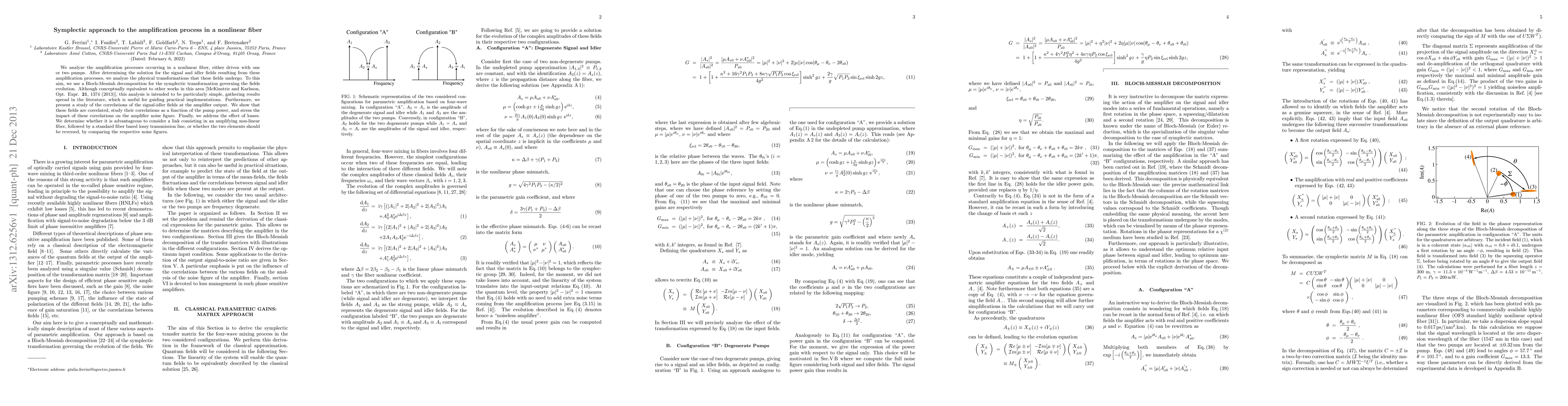 We analyze the amplification processes occurring in a nonlinear fiber, either driven with one or two pumps. After determining the solution for the signal and idler fields resulting from these amplification processes, we analyze the physical transformations that these fields undergo. To this aim, we use a Bloch-Messiah decomposition for the symplectic transformation governing the fields evolution. Although conceptually equivalent to other works in this area [McKinstrie and Karlsson, Opt. Expr. 21, 1374 (2013)], this analysis is intended to be particularly simple, gathering results spread in the literature, which is useful for guiding practical implementations. Furthermore, we present a study of the correlations of the signal-idler fields at the amplifier output. We show that these fields are correlated, study their correlations as a function of the pump power, and stress the impact of these correlations on the amplifier noise figure. Finally, we address the effect of losses. We determine whether it is advantageous to consider a link consisting in an amplifying non-linear fiber, followed by a standard fiber based lossy transmission line, or whether the two elements should be reversed, by comparing the respective noise figures.