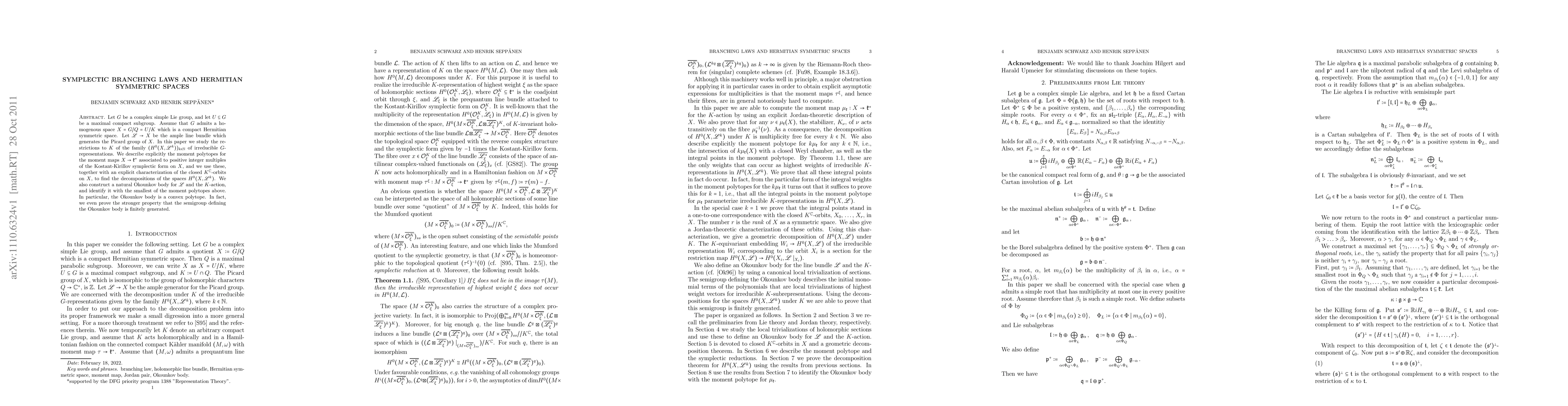 This paper studies symplectic branching laws for compact Hermitian symmetric spaces, focusing on the Picard group of a homogeneous space and its moment polytopes, to understand the decompositions of irreducible G-representations.