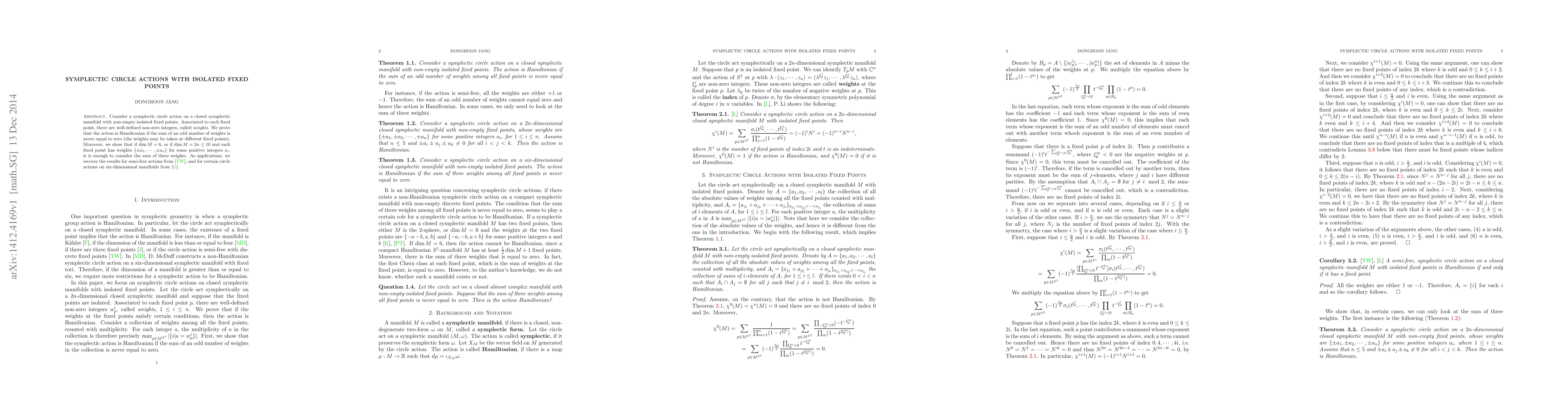 This paper studies symplectic circle actions on closed symplectic manifolds with isolated fixed points, proving that the action is Hamiltonian if the sum of an odd number of weights is never zero. It further shows that for dimensions 6 or up to 10 with specific weight configurations, considering only three weights suffices for this condition. Applications include results for semi-free actions and certain circle actions on six-dimensional manifolds.