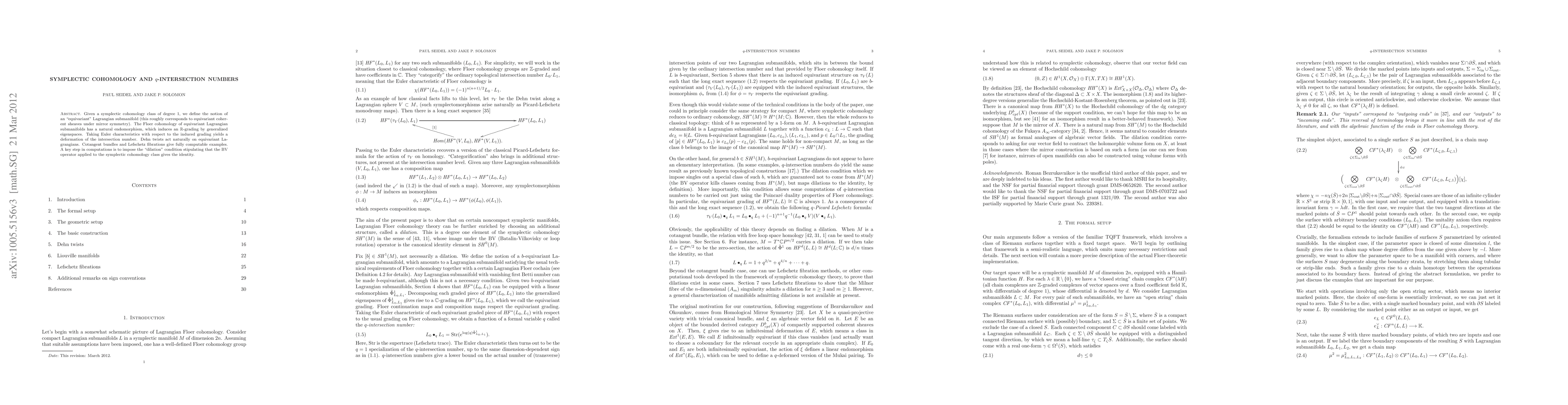 Given a symplectic cohomology class of degree 1, we define the notion of an equivariant Lagrangian submanifold. The Floer cohomology of equivariant Lagrangian submanifolds has a natural endomorphism, which induces a grading by generalized eigenspaces. Taking Euler characteristics with respect to the induced grading yields a deformation of the intersection number. Dehn twists act naturally on equivariant Lagrangians. Cotangent bundles and Lefschetz fibrations give fully computable examples. A key step in computations is to impose the "dilation" condition stipulating that the BV operator applied to the symplectic cohomology class gives the identity. Equivariant Lagrangians mirror equivariant objects of the derived category of coherent sheaves.