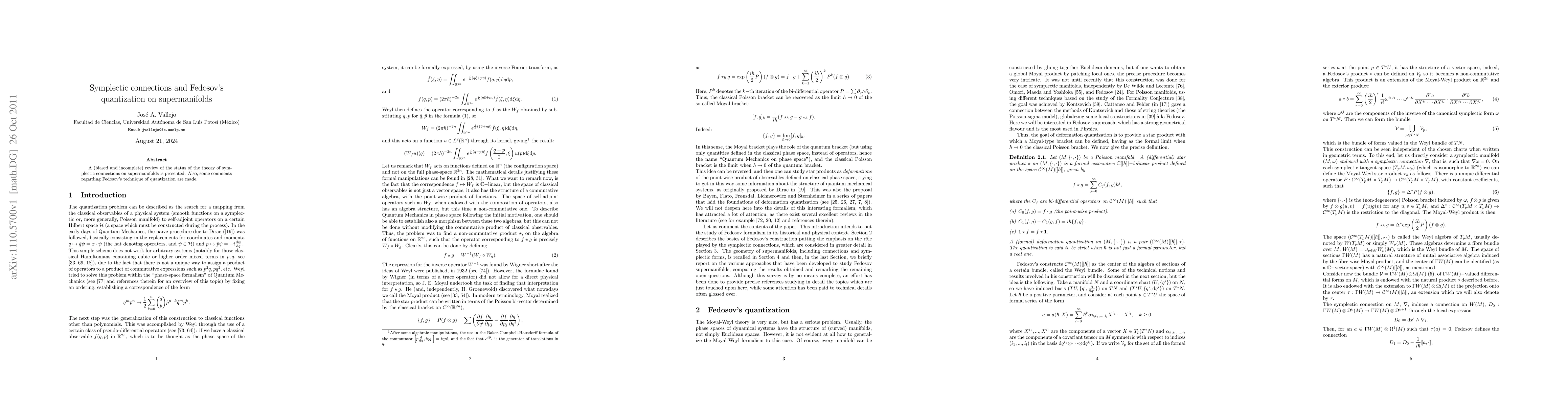 This paper reviews the current state of symplectic connections on supermanifolds and offers insights into Fedosov's approach to quantization on these geometric structures. It highlights ongoing challenges and developments in the field.