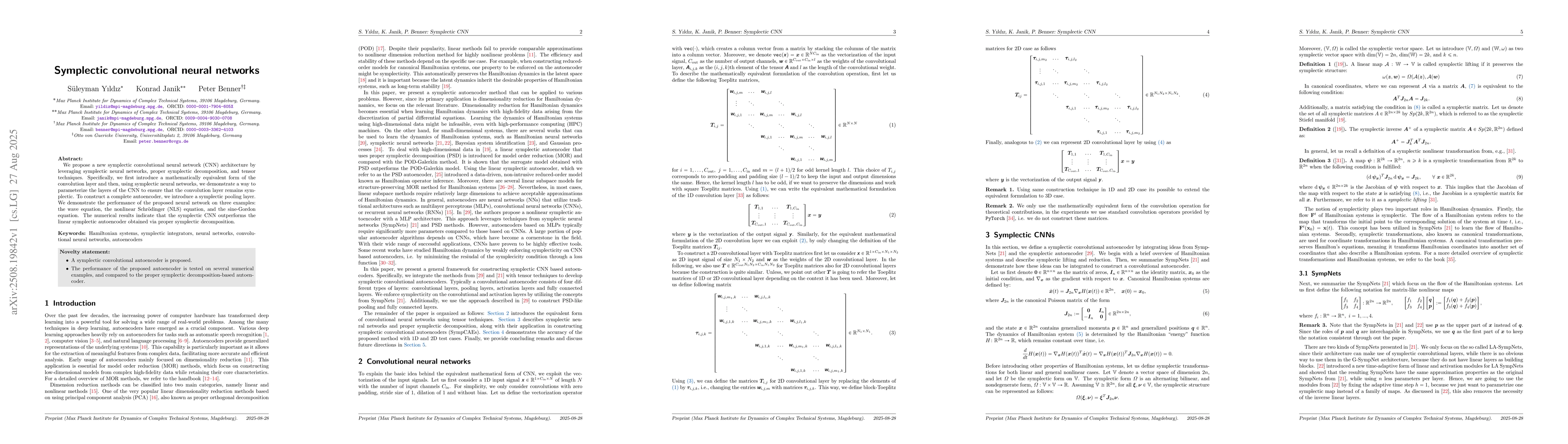 We propose a new symplectic convolutional neural network (CNN) architecture by leveraging symplectic neural networks, proper symplectic decomposition, and tensor techniques. Specifically, we first introduce a mathematically equivalent form of the convolution layer and then, using symplectic neural networks, we demonstrate a way to parameterize the layers of the CNN to ensure that the convolution layer remains symplectic. To construct a complete autoencoder, we introduce a symplectic pooling layer. We demonstrate the performance of the proposed neural network on three examples: the wave equation, the nonlinear Schr\"odinger (NLS) equation, and the sine-Gordon equation. The numerical results indicate that the symplectic CNN outperforms the linear symplectic autoencoder obtained via proper symplectic decomposition.