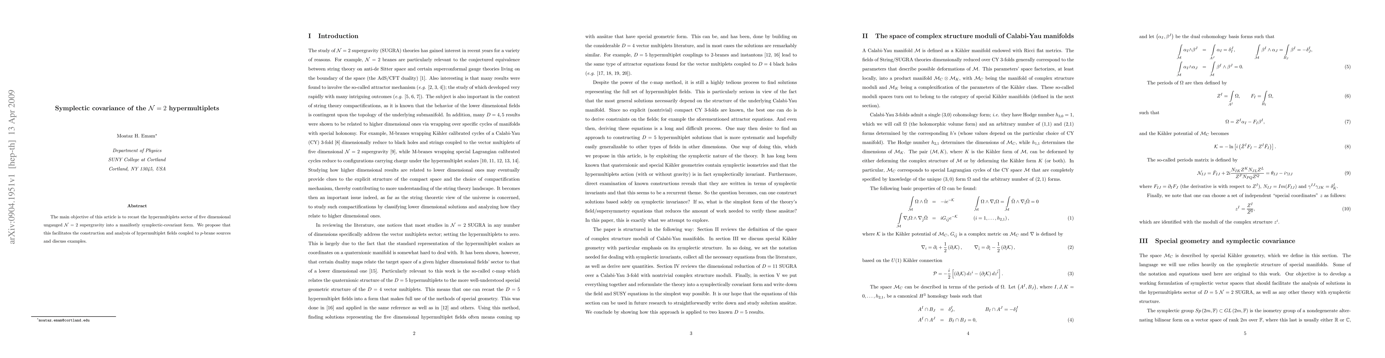 The main objective of this article is to recast the hypermultiplets sector of five dimensional ungauged N=2 supergravity into a manifestly symplectic-covariant form. We propose that this facilitates the construction and analysis of hypermultiplet fields coupled to p-brane sources and discuss examples.