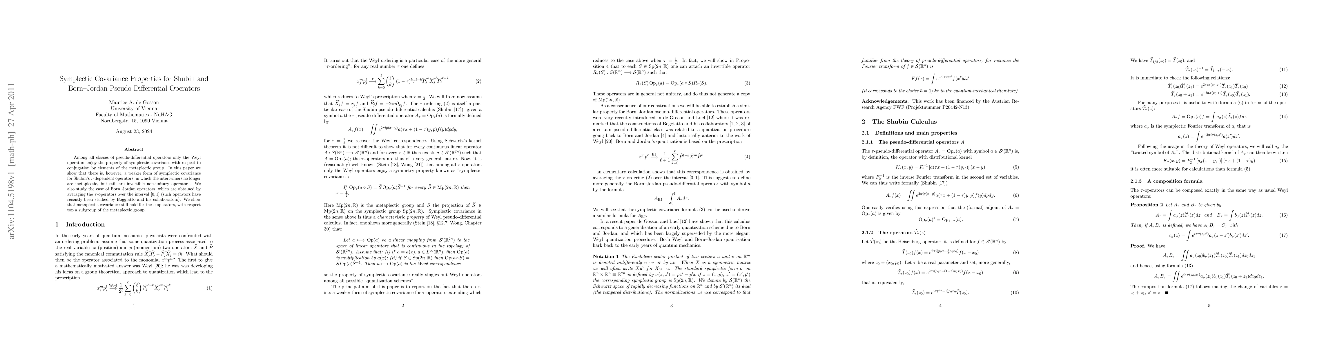 Among all classes of pseudo-differential operators only the Weyl operators enjoy the property of symplectic covariance with respect to conjugation by elements of the metaplectic group. In this paper we show that there is, however, a weaker form of symplectic covariance for Shubin's {\tau}-dependent operators, in which the intertwiners no longer are metaplectic, but still are invertible non-unitary operators. We also study the case of Born--Jordan operators, which are obtained by averaging the {\tau}-operators over the interval [0,1] (such operators have recently been studied by Boggiatto and his collaborators). We show that metaplectic covariance still hold for these operators, with respect top a subgroup of the metaplectic group.