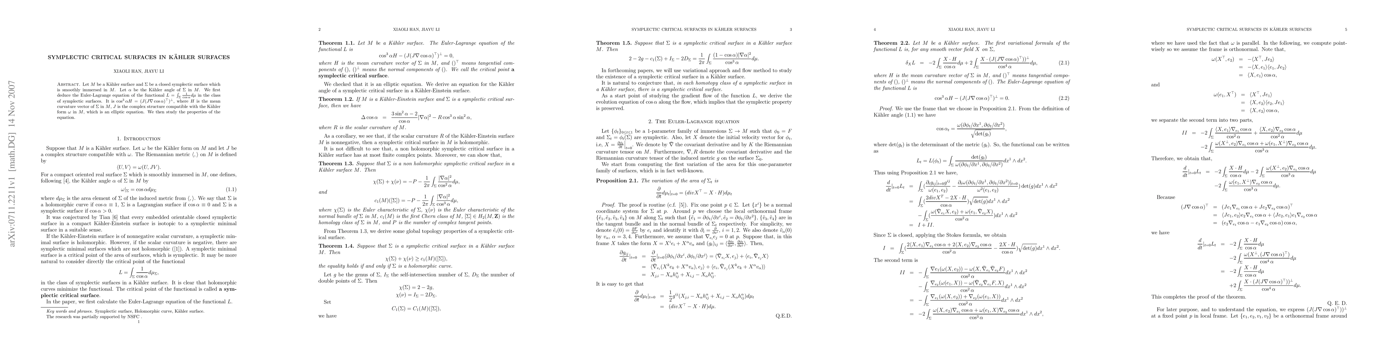 This paper investigates symplectic critical surfaces in Kähler surfaces, deriving the Euler-Lagrange equation for the functional $L=\int_{\Sigma}\frac{1}{\cos\alpha}d\mu$ and analyzing the properties of the resulting elliptic equation $\cos^3\alpha H=(J(J\nabla\cos\alpha)^\top)^\bot$.