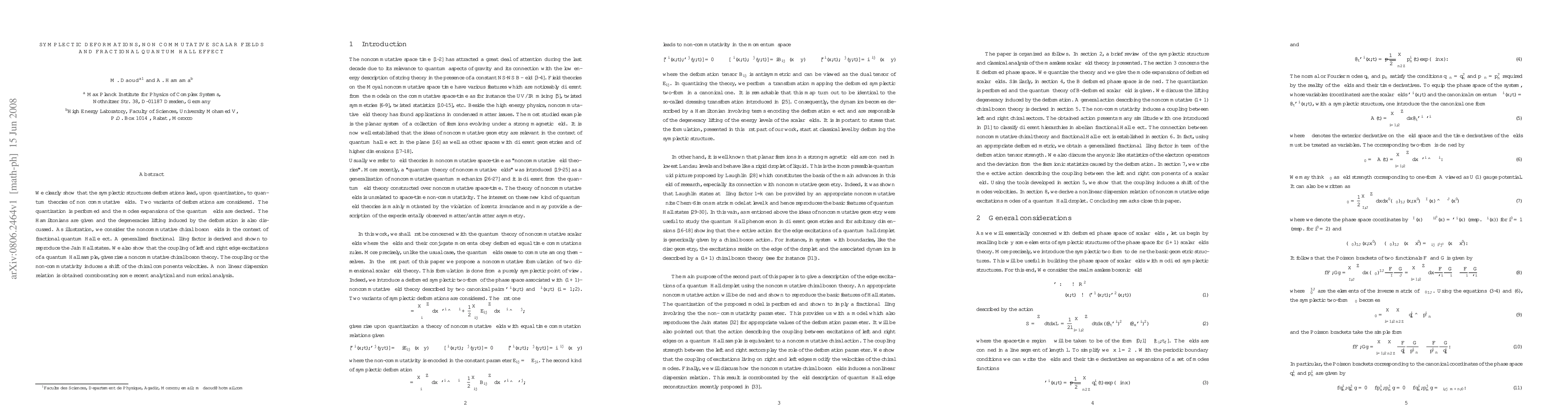 The paper demonstrates how symplectic deformations, upon quantization, lead to quantum theories with noncommutative scalar fields, deriving Hamiltonians and discussing degeneracies lifting. It applies these concepts to the fractional quantum Hall effect, deriving a generalized fractional filling factor that reproduces Jain Hall states and showing a noncommutative chiral boson theory that induces shifts in chiral velocities and a nonlinear dispersion relation.