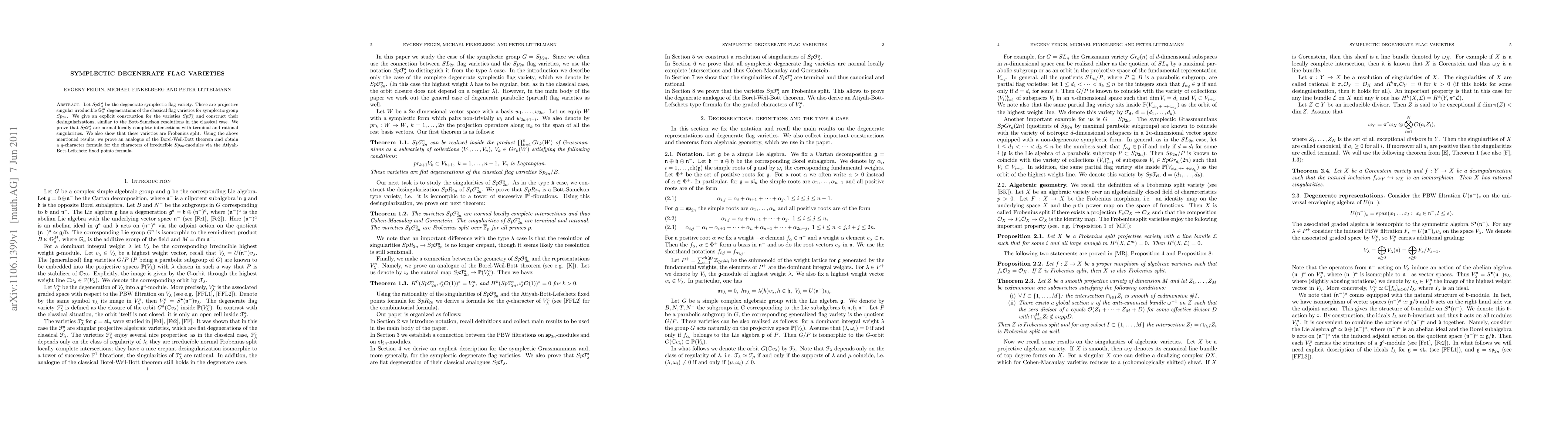 This paper constructs degenerate symplectic flag varieties $\SF^a_\lambda$ for the symplectic group $Sp_{2n}$ and proves they are normal locally complete intersections with terminal and rational singularities. The authors also show these varieties are Frobenius split and use these properties to establish a Borel-Weil-Bott theorem analogue and derive a $q$-character formula for $Sp_{2n}$-modules.