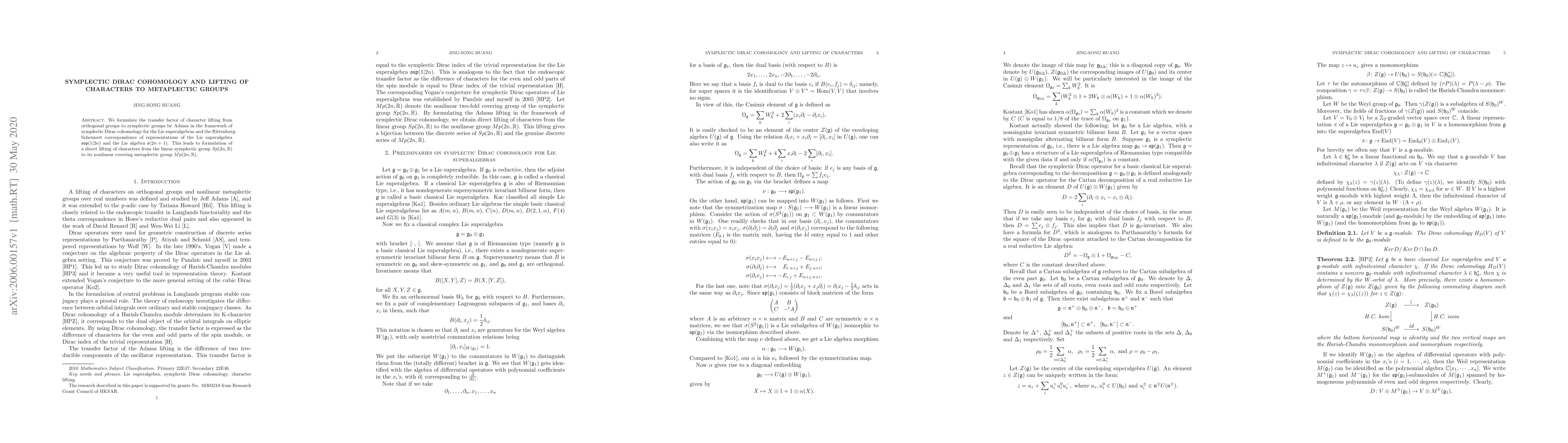 We formulate the transfer factor of character lifting from orthogonal groups to symplectic groups by Adams in the framework of symplectic Dirac cohomology for the Lie superalgebras and the Rittenberg-Scheunert correspondence of representations of the Lie superalgebra $\fro\frsp(1|2n)$ and the Lie algebra $\fro(2n+1)$. This leads to formulation of a direct lifting of characters from the linear symplectic group $Sp(2n,\bbR)$ to its nonlinear covering metaplectic group $Mp(2n,\bbR)$.