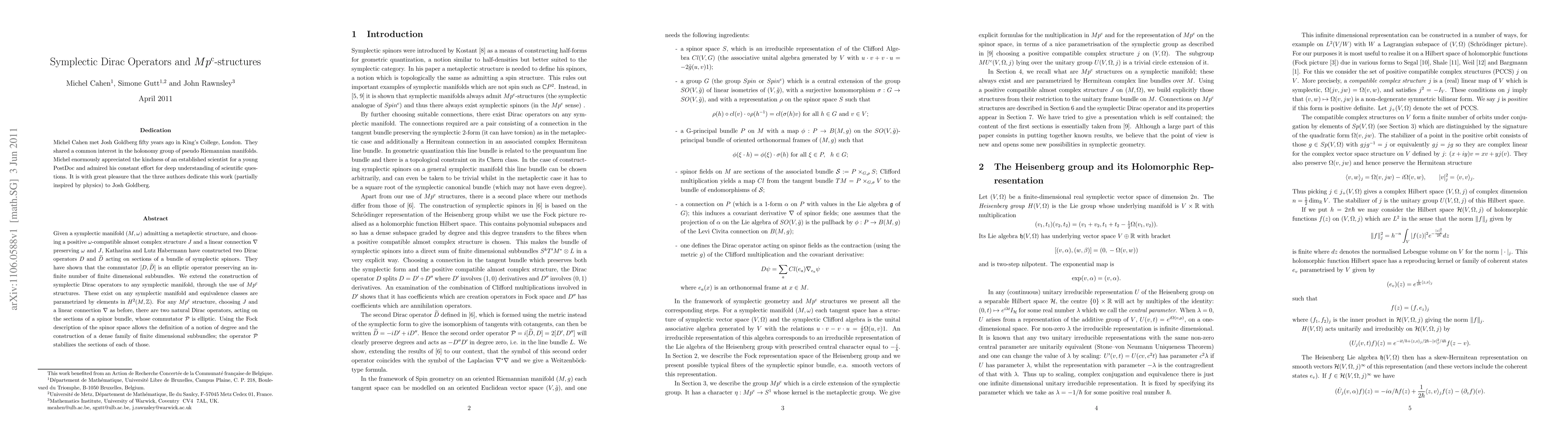This paper extends the construction of symplectic Dirac operators to any symplectic manifold using metaplectic (Mpc) structures, demonstrating that their commutator is an elliptic operator preserving an infinite number of finite-dimensional subbundles, defined through the Fock description of the spinor space.