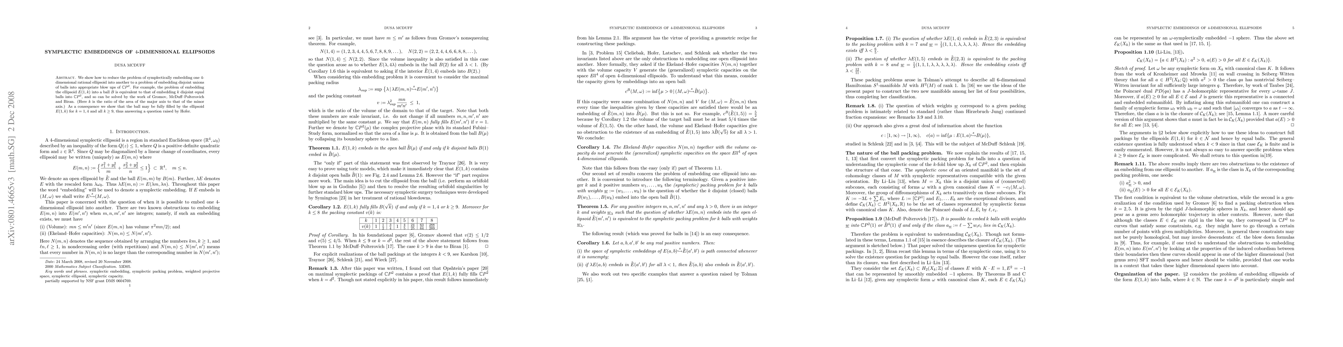We show how to reduce the problem of symplectically embedding one 4-dimensional rational ellipsoid into another to a problem of embedding disjoint unions of balls into appropriate blow ups of \C P^2. For example, the problem of embedding the ellipsoid E(1,k) into a ball B is equivalent to that of embedding k disjoint equal balls into \C P^2, and so can be solved by the work of Gromov, McDuff--Polterovich and Biran. (Here k is the ratio of the area of the major axis to that of the minor axis.) As a consequence we show that the ball may be fully filled by the ellipsoid E(1,k) for k=1,4 and all k\ge 9, thus answering a question raised by Hofer.