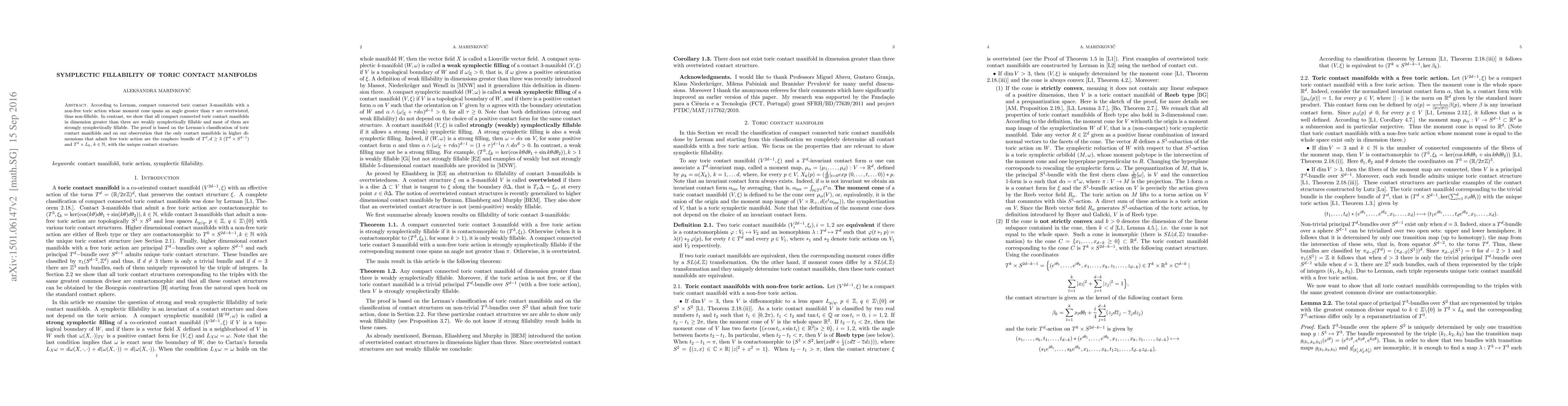 The paper demonstrates that all compact connected toric contact manifolds in dimensions greater than three are weakly symplectically fillable, with most being strongly fillable, contrasting with lower-dimensional cases. The proof leverages Lerman’s classification of toric contact manifolds and identifies that only specific higher-dimensional manifolds with free toric action are non-unique in their contact structure.