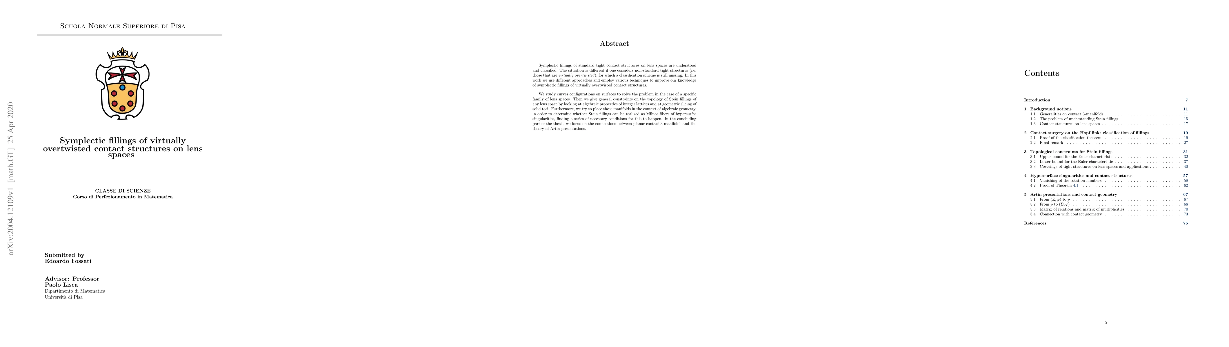 This research investigates symplectic fillings of virtually overtwisted contact structures on lens spaces, employing techniques to study specific lens space families and general topological constraints. The study explores algebraic properties and connections to algebraic geometry to determine if Stein fillings can be realized as Milnor fibers, concluding with links to planar contact 3-manifolds and Artin presentations.